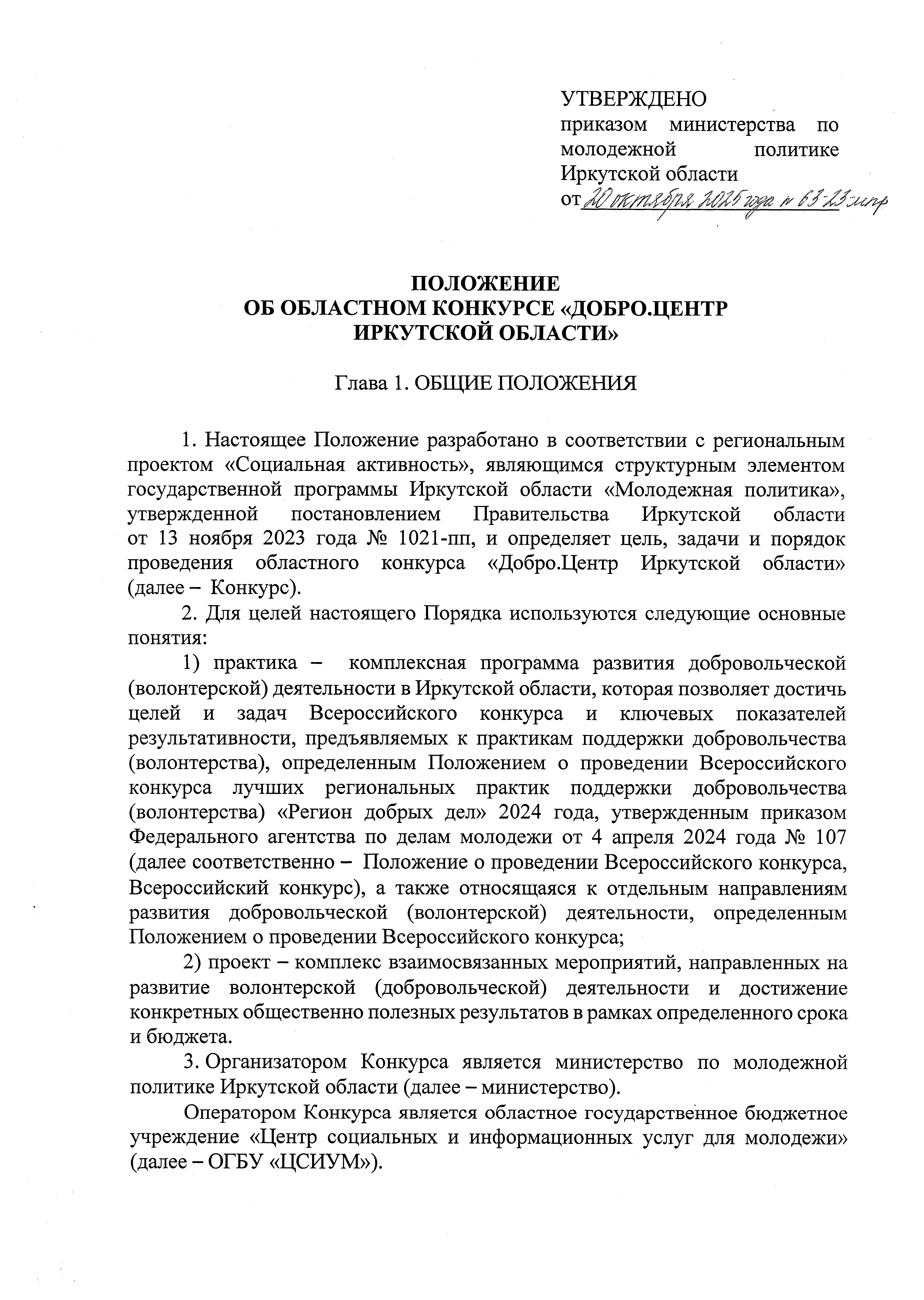 Приказ Министерства по молодежной политике Иркутской области от 20.10.2025 № 63-23-мпр