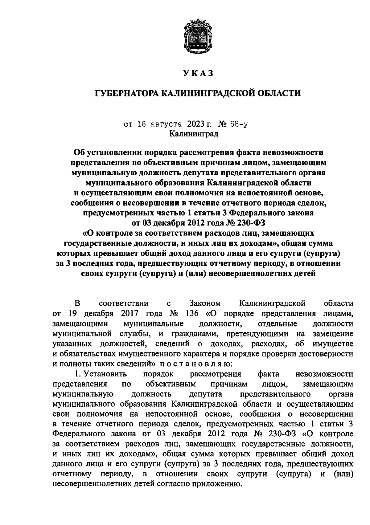 Указ Губернатора Калининградской области от 16.08.2023 № 68-у
