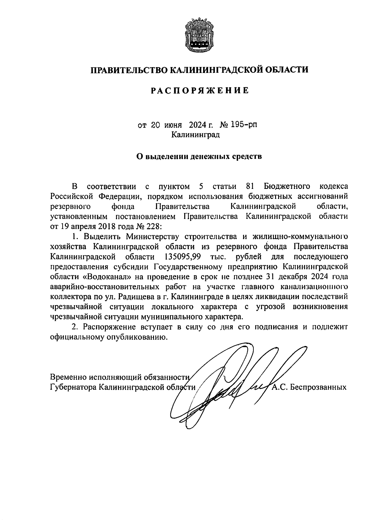 Распоряжение Правительства Калининградской области от 20.06.2024 № 195-рп