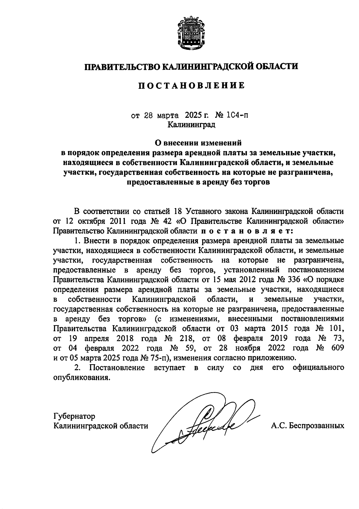 Постановление Правительства Калининградской области от 28.03.2025 № 104-п