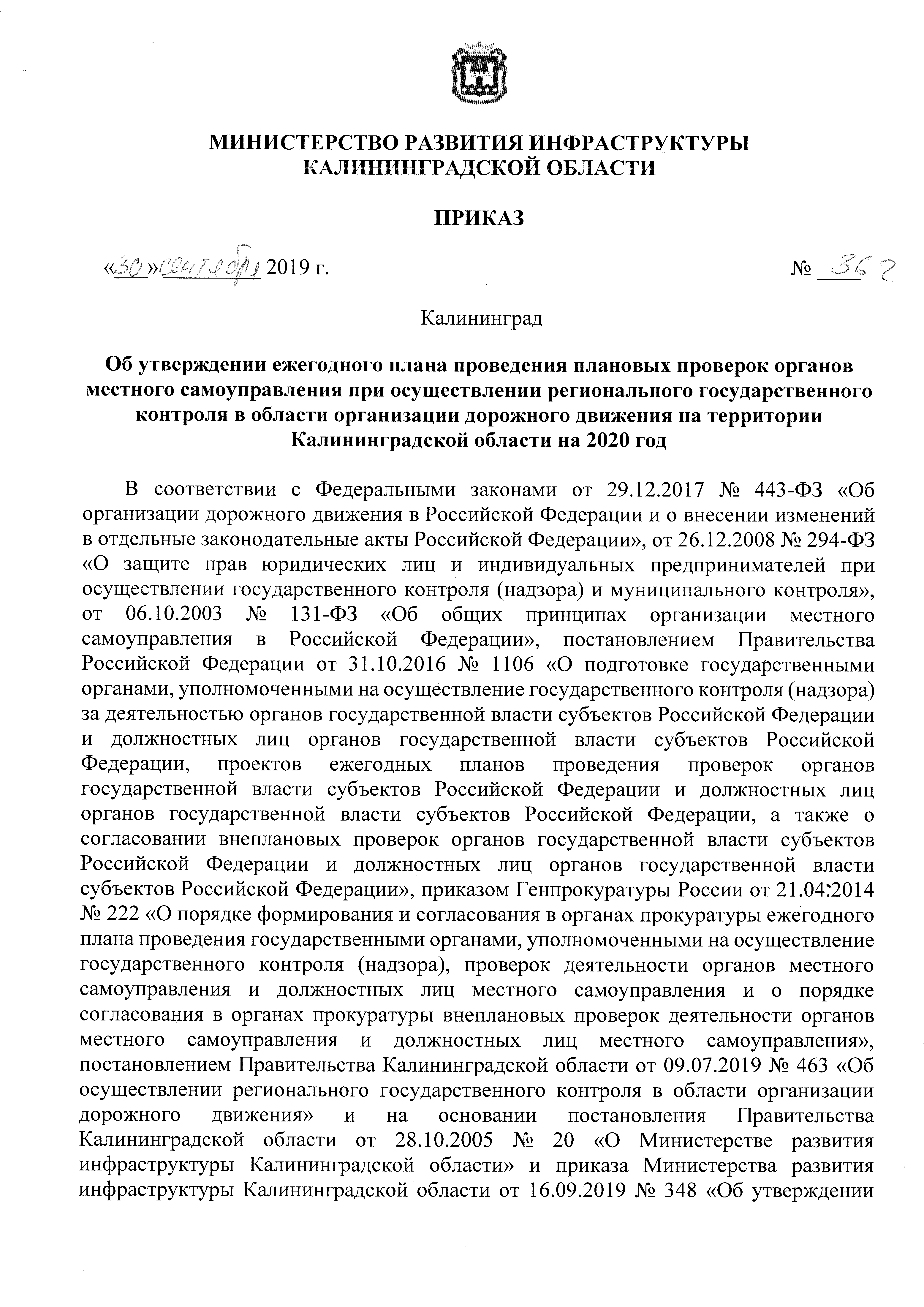 Приказ Министерства развития инфраструктуры Калининградской области от 30.09.2019 № 362