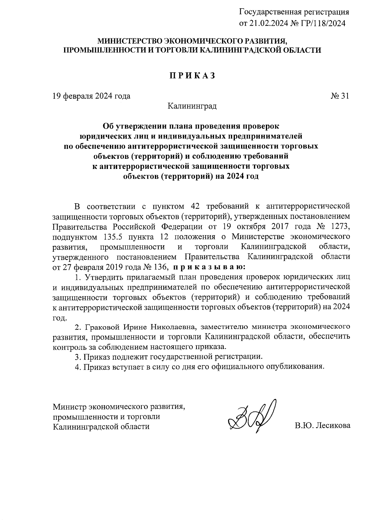 Приказ Министерства экономического развития, промышленности и торговли Калининградской области от 19.02.2024 № 31