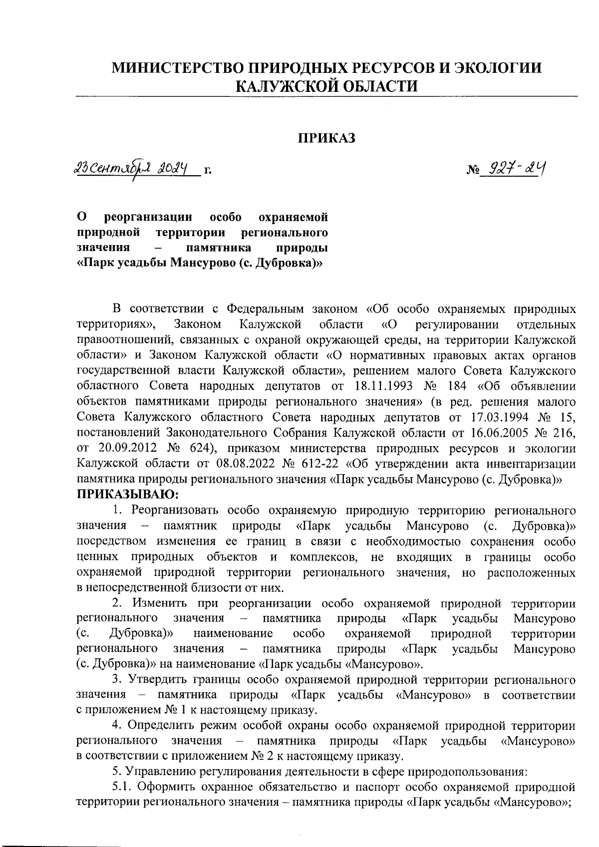 Приказ Министерства природных ресурсов и экологии Калужской области от 23.09.2024 № 927-24