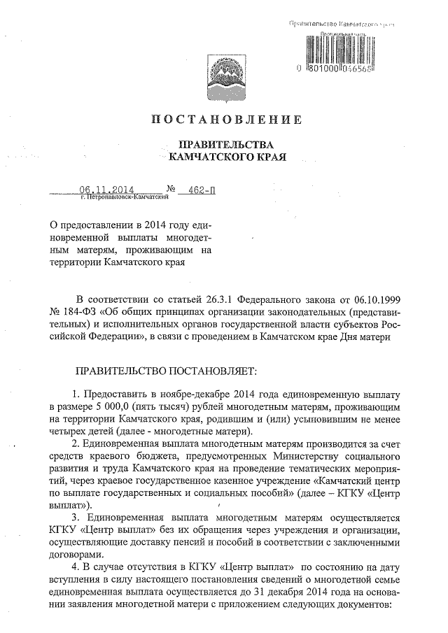 Постановление Правительства Камчатского края от 06.11.2014 № 462-П