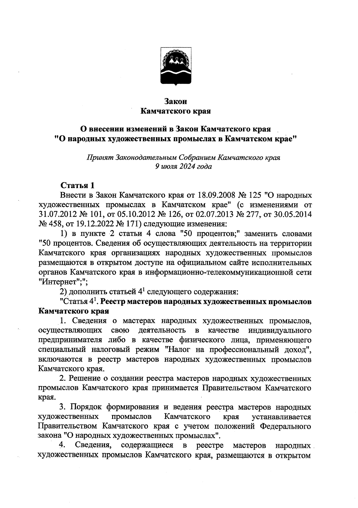 "О внесении изменений в Закон Камчатского края "О народных художественных промыслах в Камчатском крае"