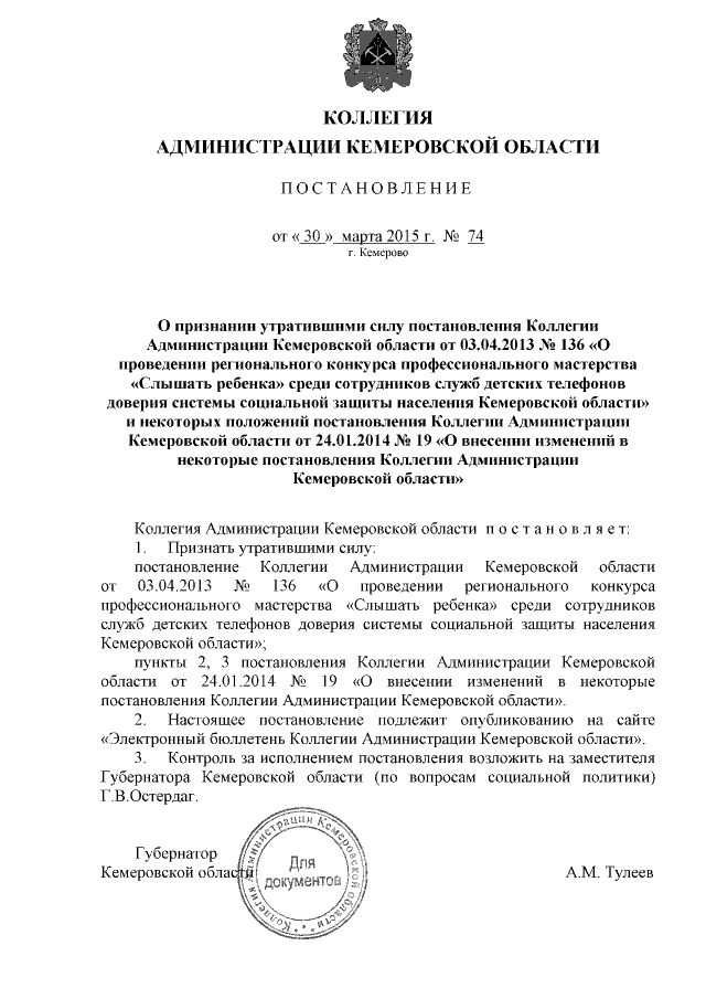 Постановление Коллегии Администрации Кемеровской области от 30.03.2015 № 74