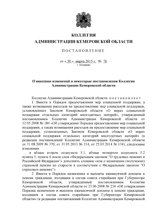 Постановление Коллегии Администрации Кемеровской области от 30.03.2015 № 76