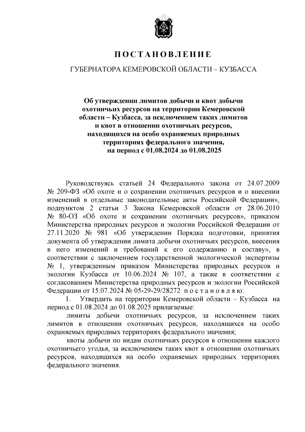"Об утверждении лимитов добычи и квот добычи охотничьих ресурсов на территории Кемеровской области — Кузбасса, за исключением таких лимитов и квот в отношении охотничьих ресурсов, находящихся на особо охраняемых природных территориях федерального значения, на период с 01.08.2024 до 01.08.2025"