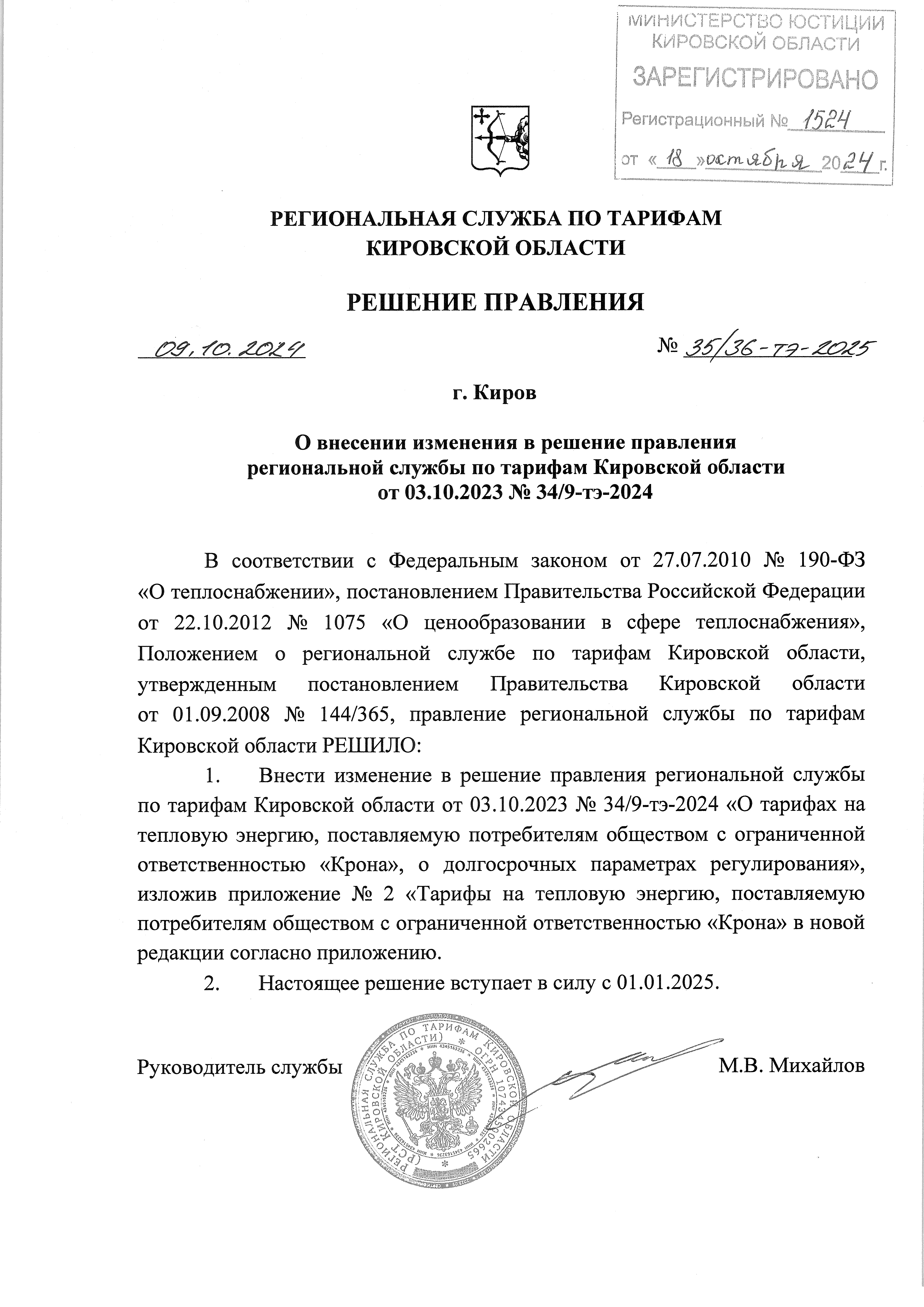 Решение правления региональной службы по тарифам Кировской области от 09.10.2024 № 35/36-тэ-2025