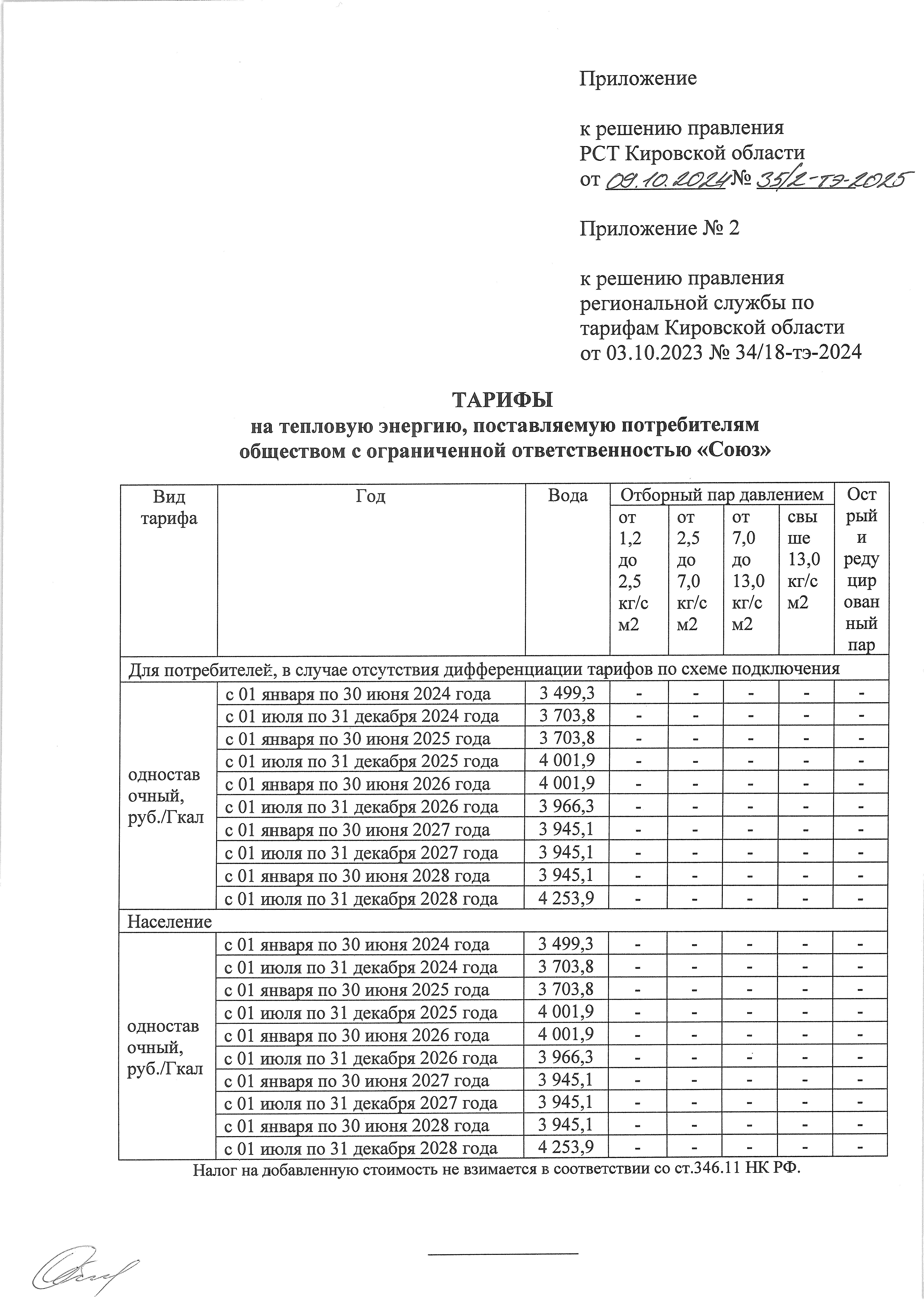 Решение правления региональной службы по тарифам Кировской области от 09.10.2024 № 35/2-тэ-2025