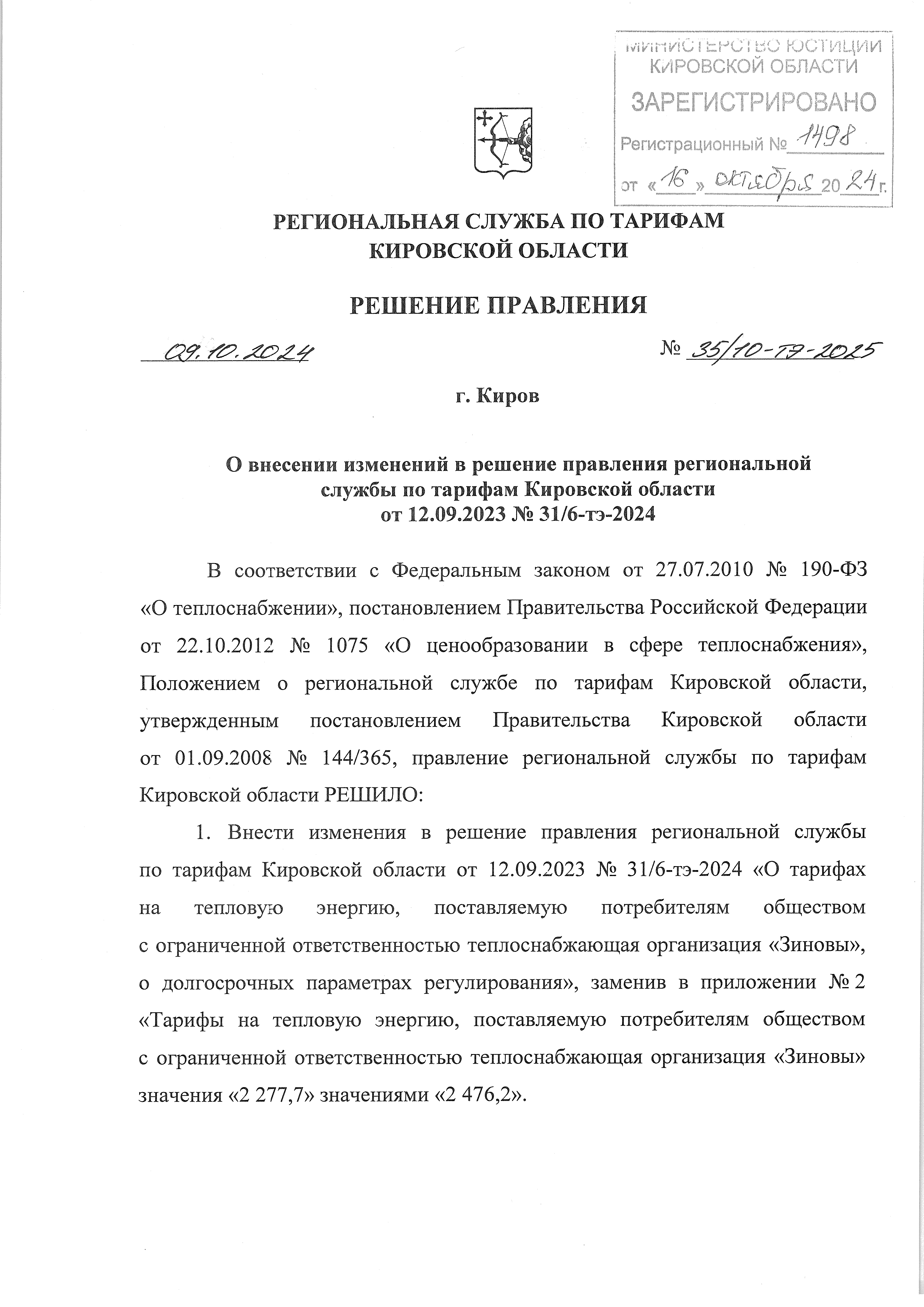 Решение правления региональной службы по тарифам Кировской области от 09.10.2024 № 35/10-тэ-2025