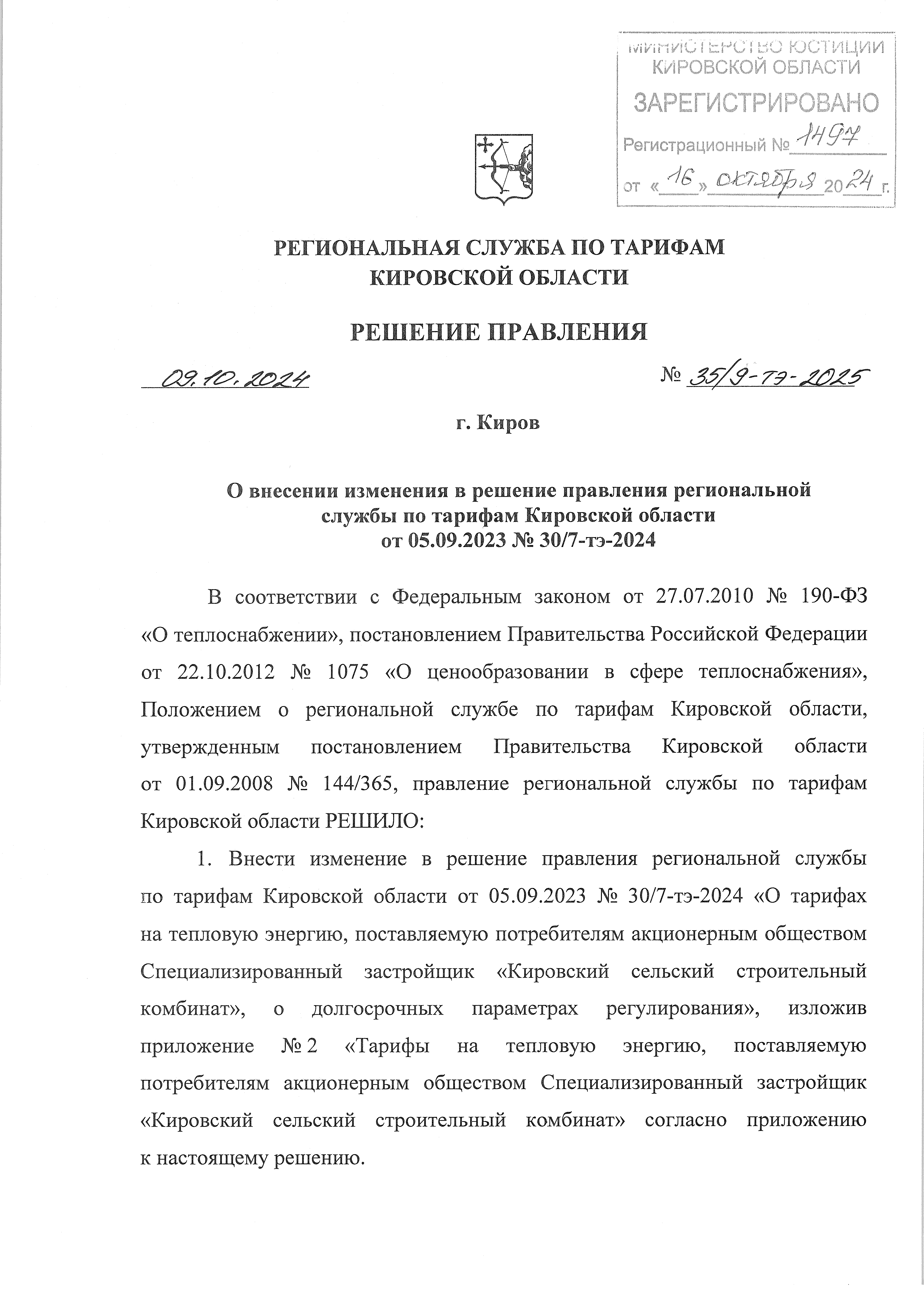Решение правления региональной службы по тарифам Кировской области от 09.10.2024 № 35/9-тэ-2025