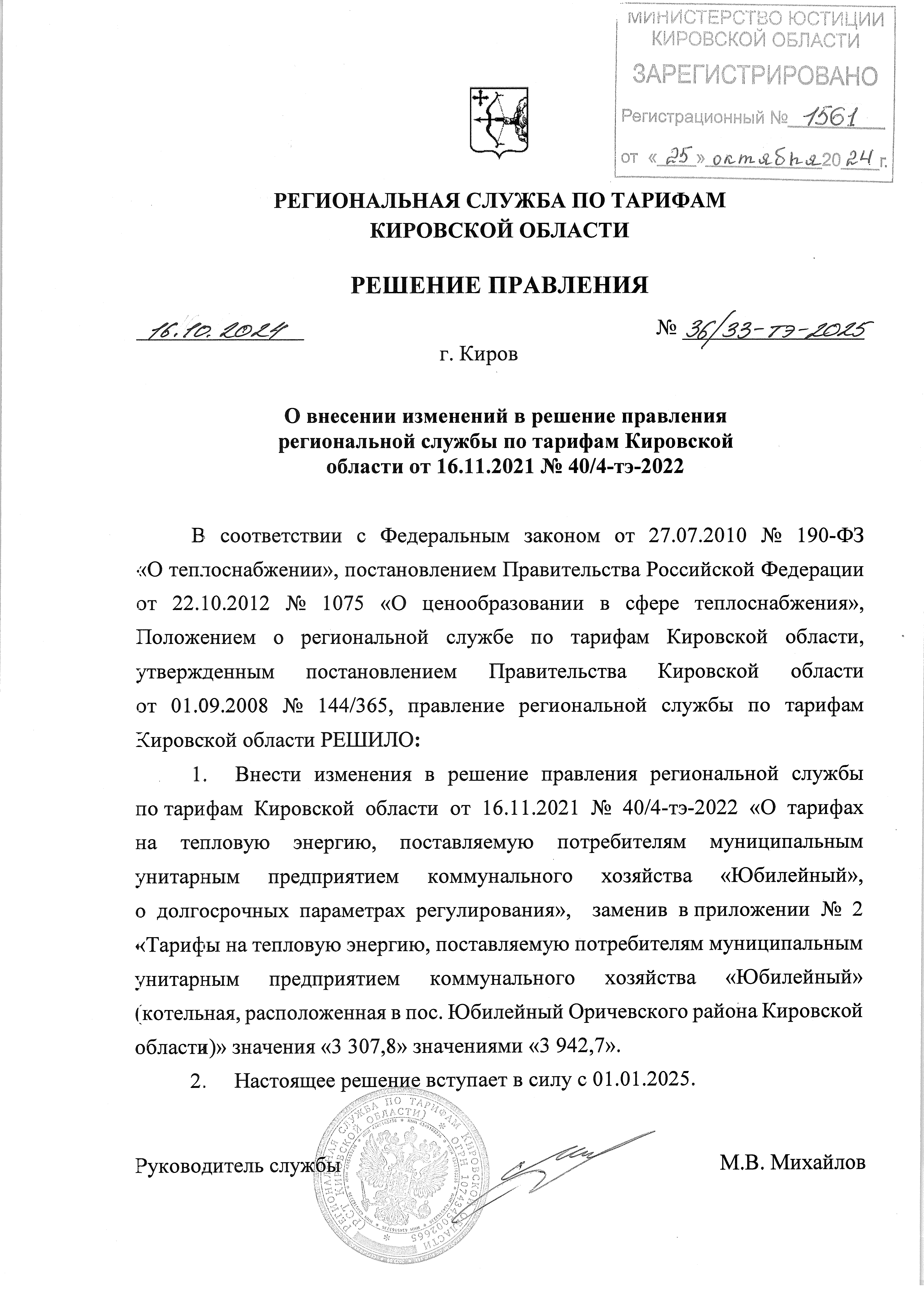 Решение правления региональной службы по тарифам Кировской области от 16.10.2024 № 36/33-тэ-2025