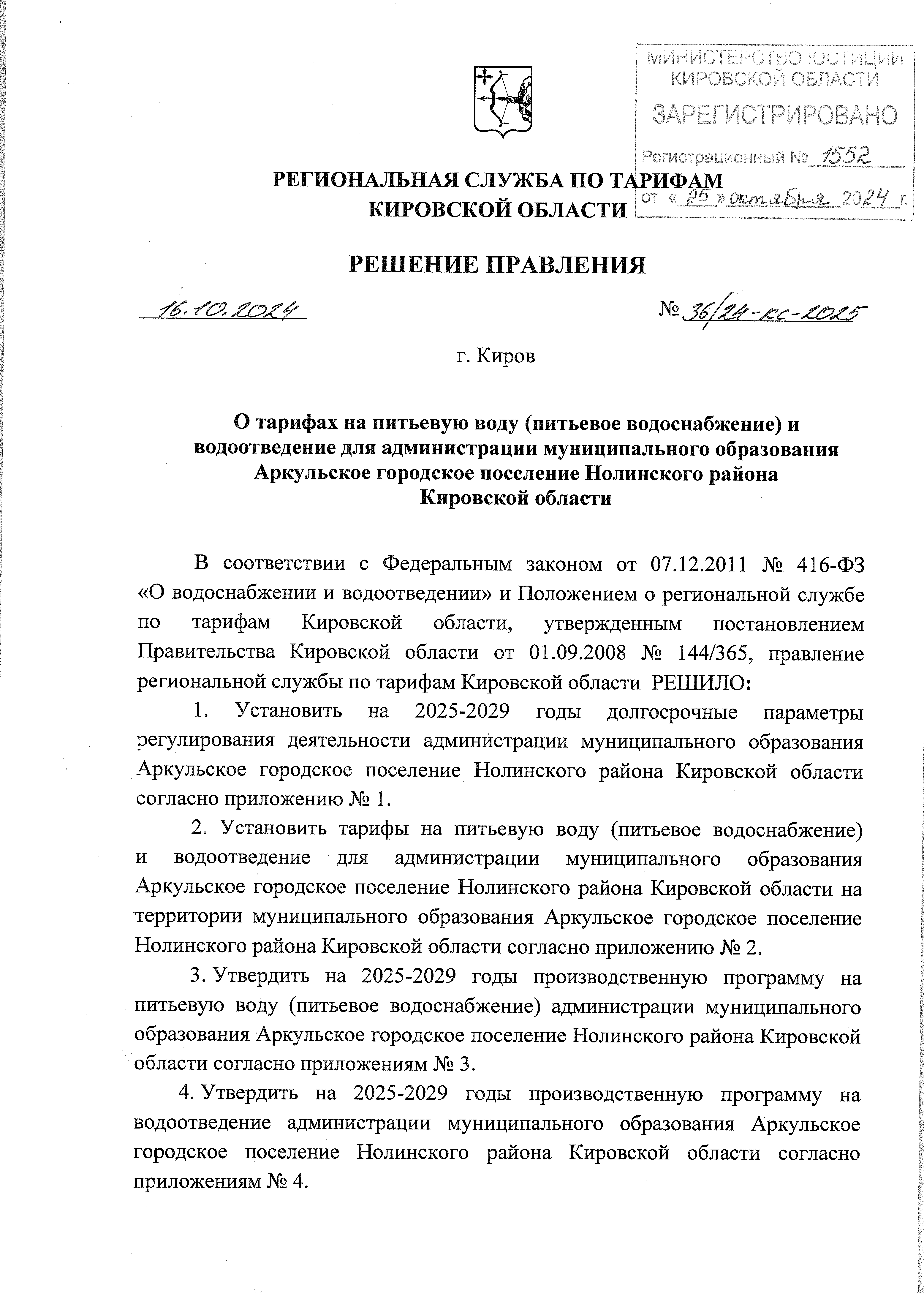 Решение правления региональной службы по тарифам Кировской области от 16.10.2024 № 36/24-кс-2025