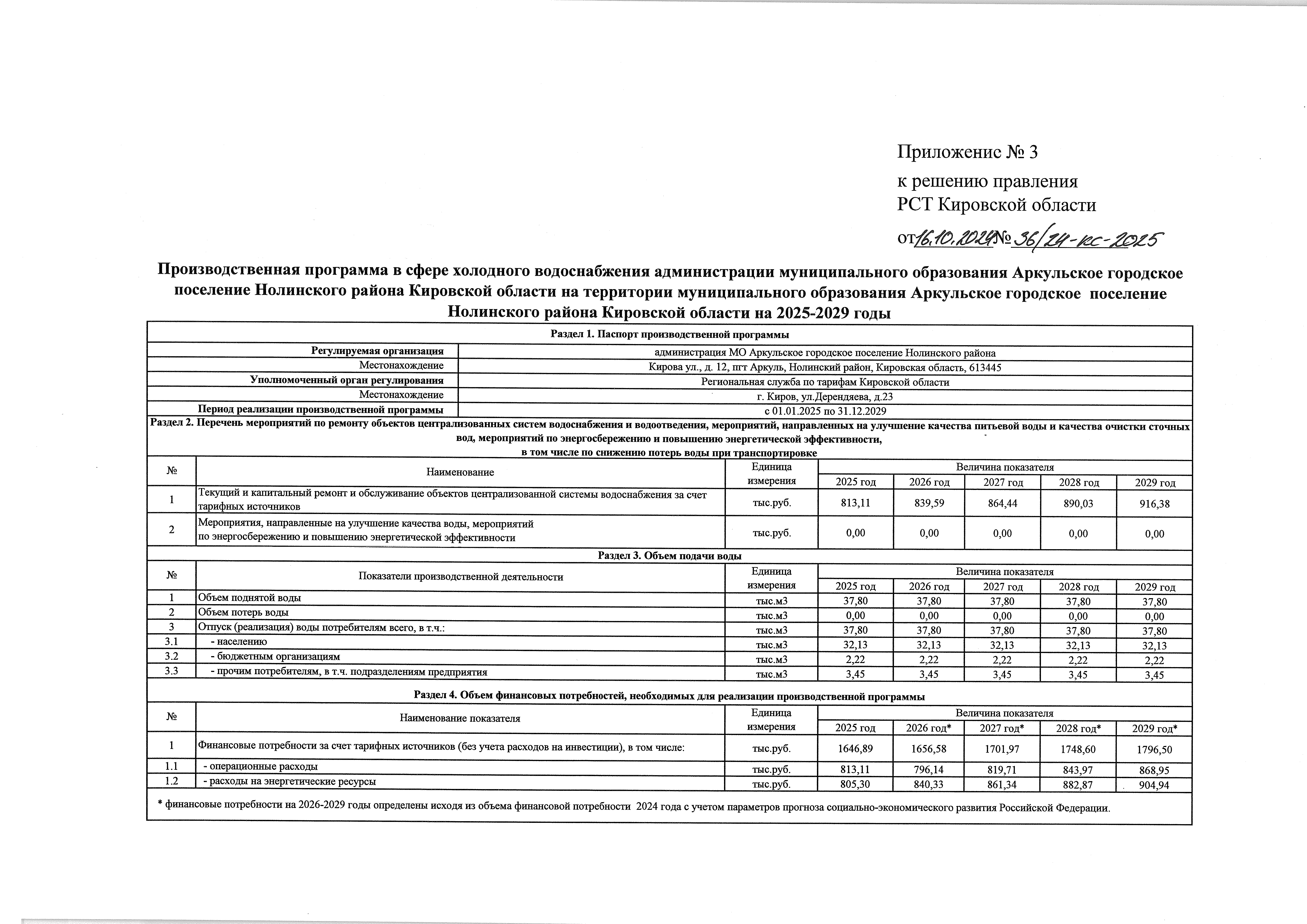 Решение правления региональной службы по тарифам Кировской области от 16.10.2024 № 36/24-кс-2025