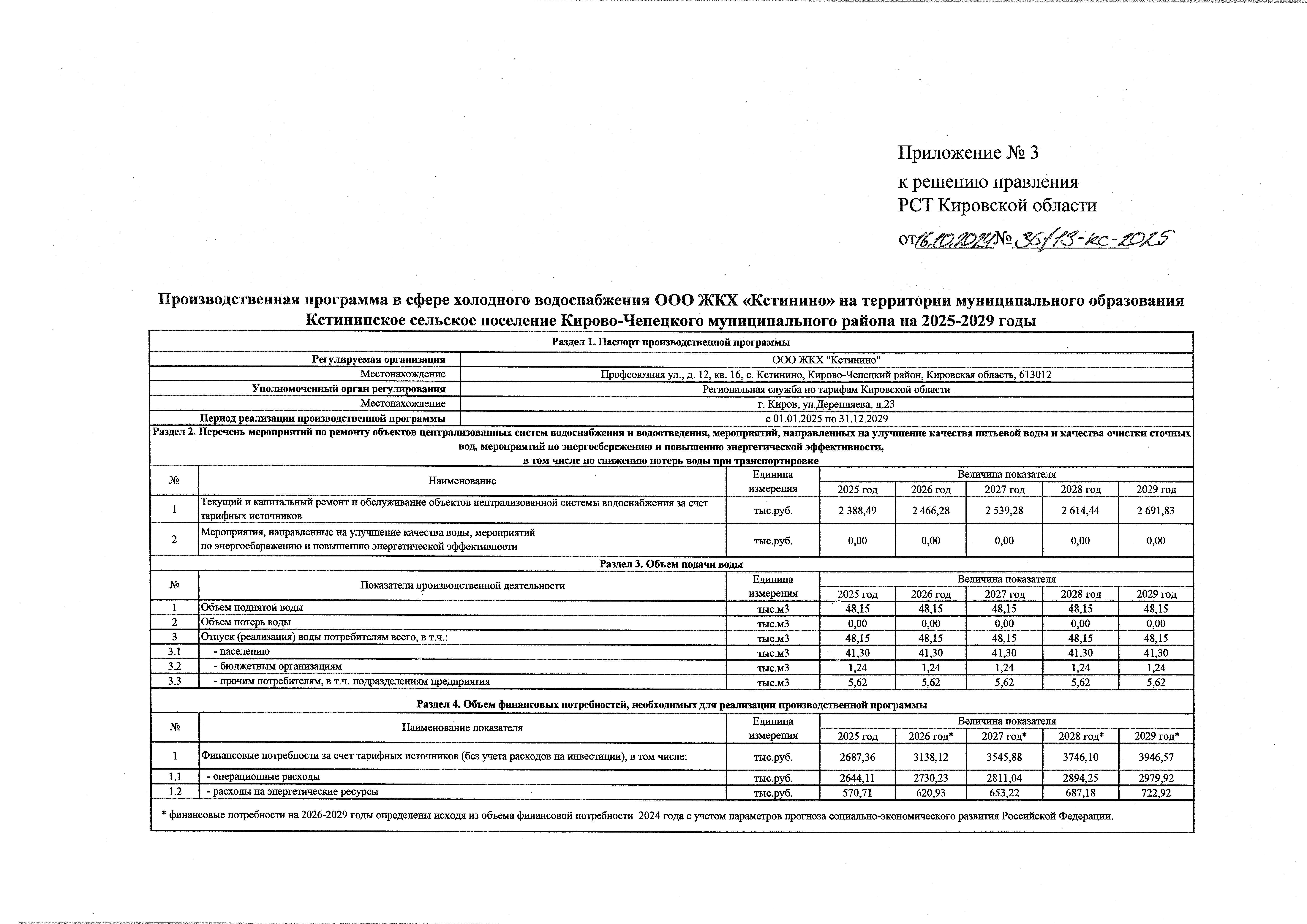 Решение правления региональной службы по тарифам Кировской области от 16.10.2024 № 36/13-кс-2025