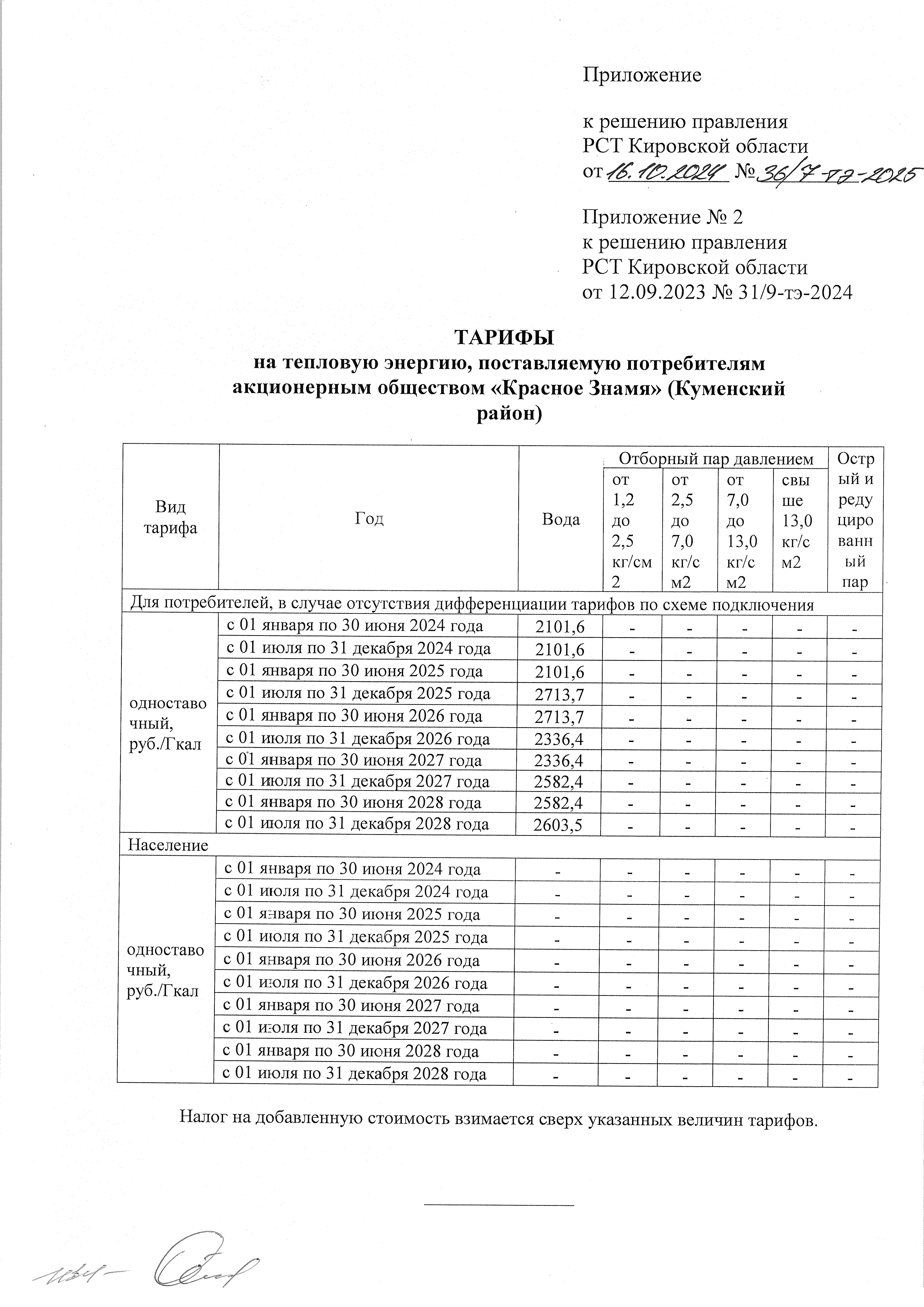 Решение правления региональной службы по тарифам Кировской области от 16.10.2024 № 36/7-тэ-2025