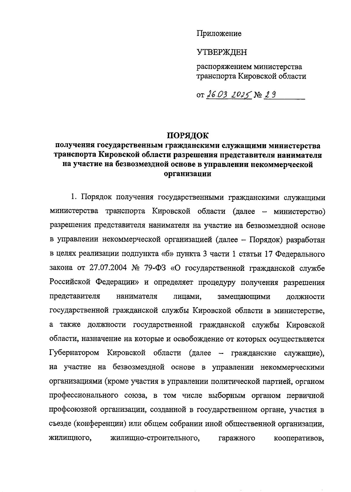 Распоряжение министерства транспорта Кировской области от 26.03.2025 № 29