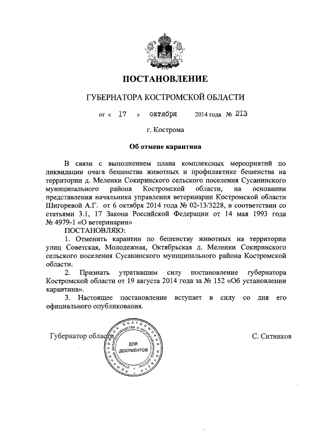 Постановление губернатора Костромской области от 17.10.2014 № 213