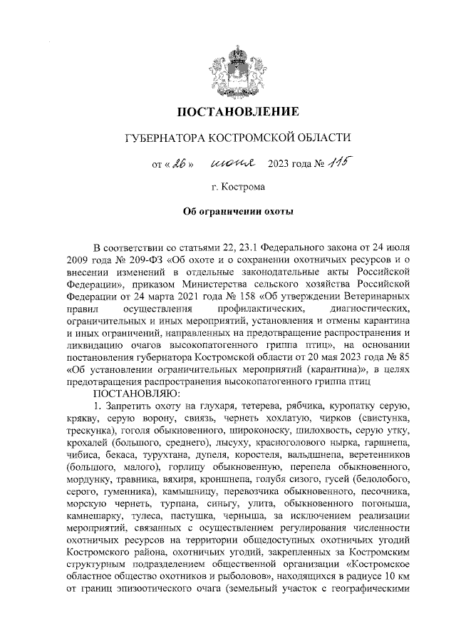 Постановление губернатора Костромской области от 26.06.2023 № 115