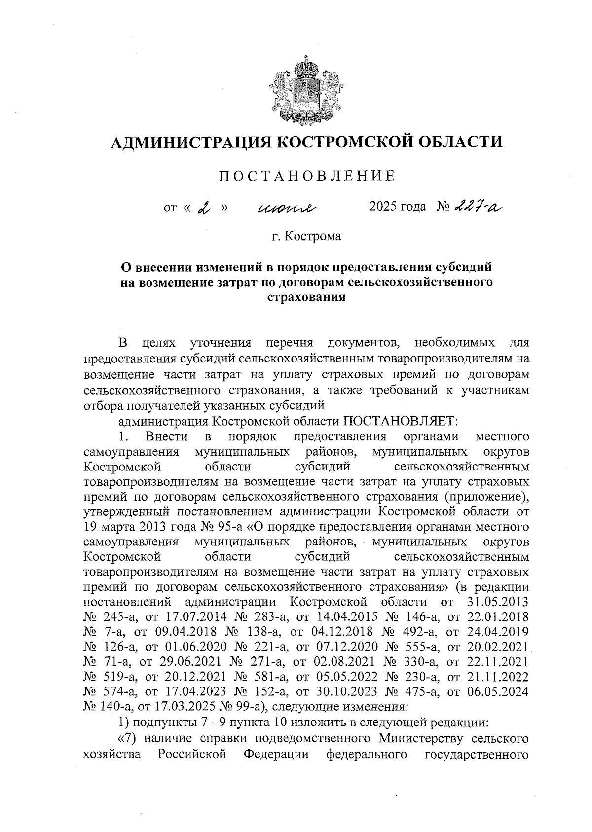Постановление администрации Костромской области от 02.06.2025 № 227-а