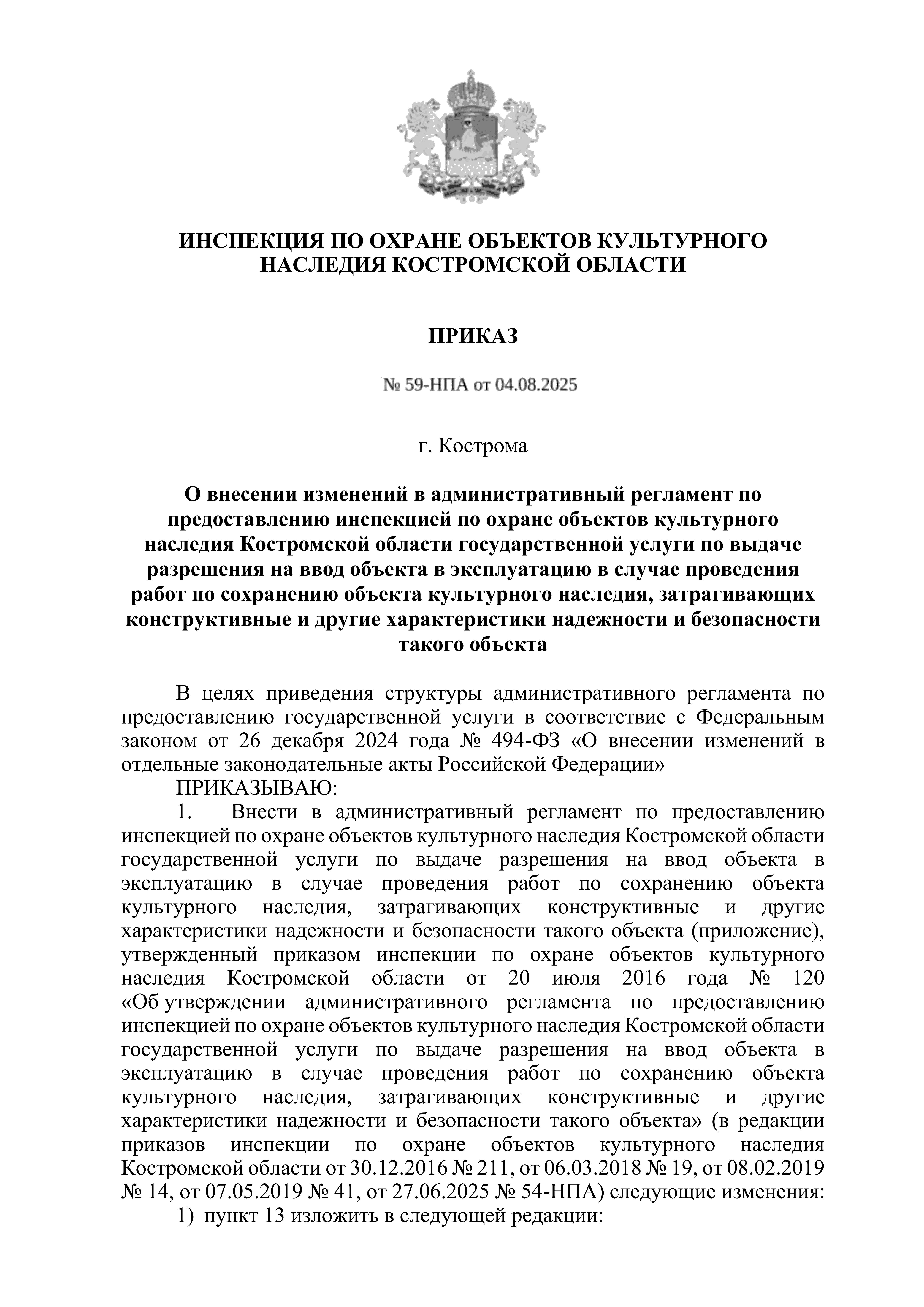 Приказ Инспекции по охране объектов культурного наследия Костромской области от 04.08.2025 № 59-НПА