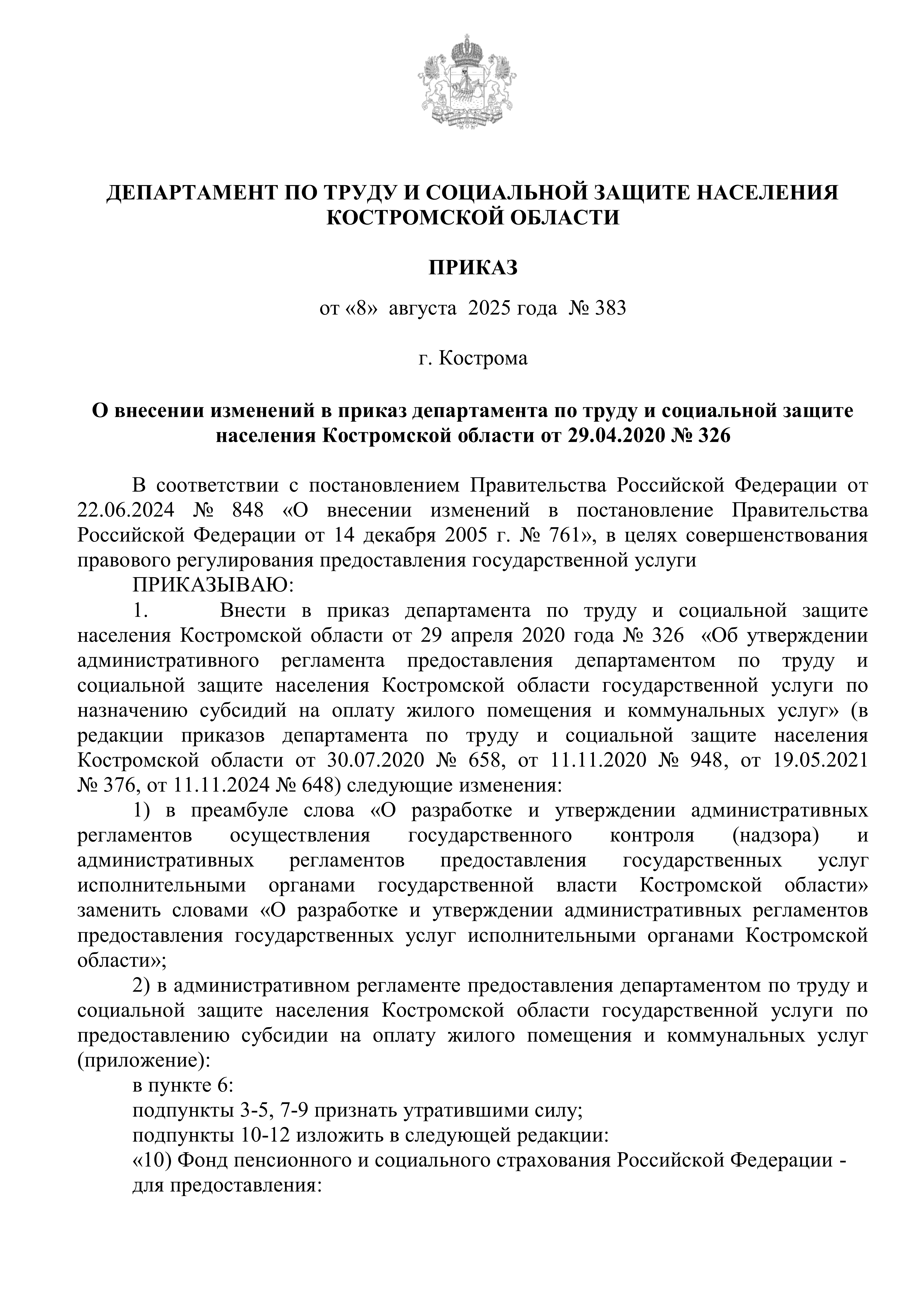 Приказ департамента по труду и социальной защите населения Костромской области от 08.08.2025 № 383