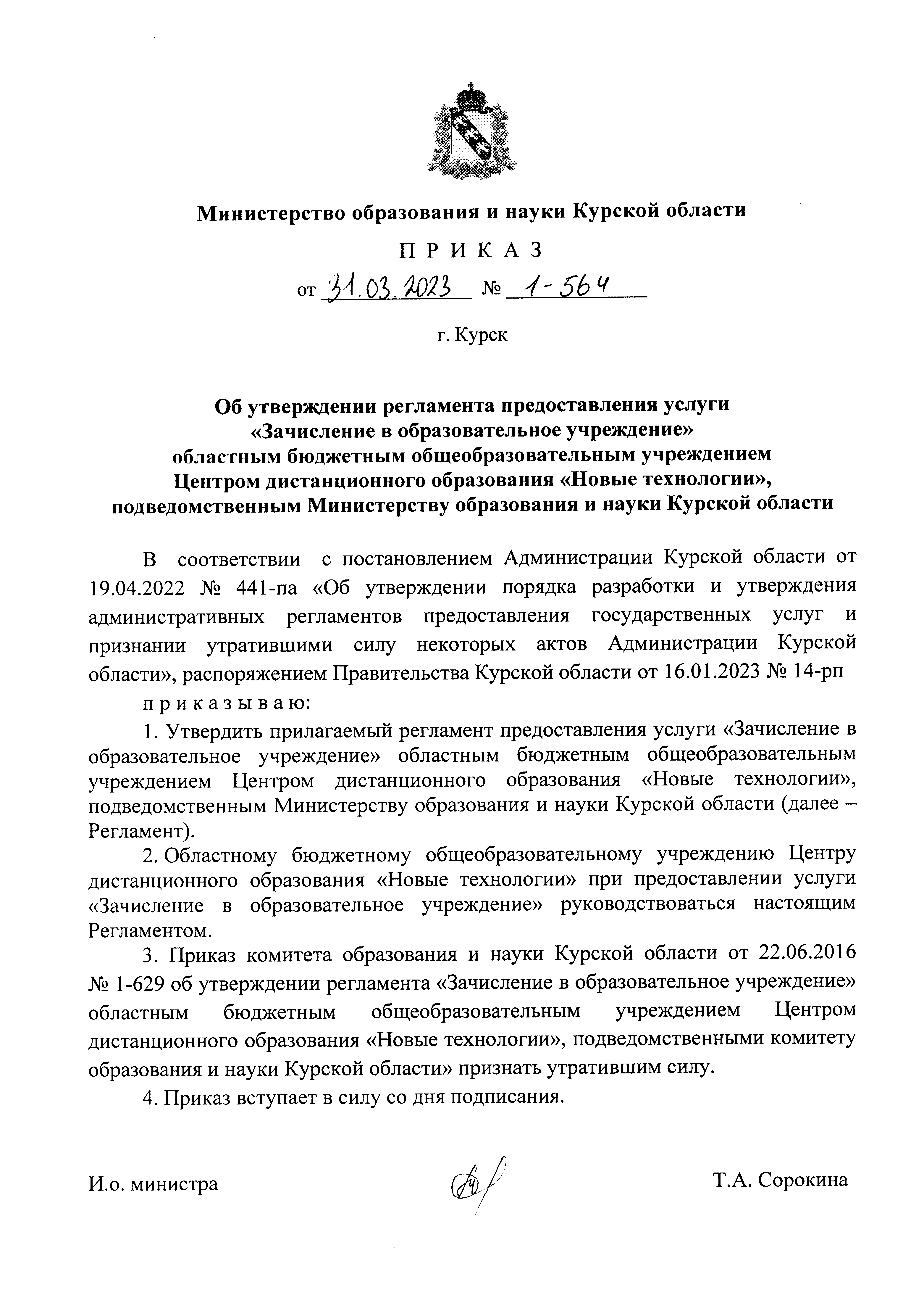 Приказ Министерства образования и науки Курской области от 31.03.2023 № 1-564