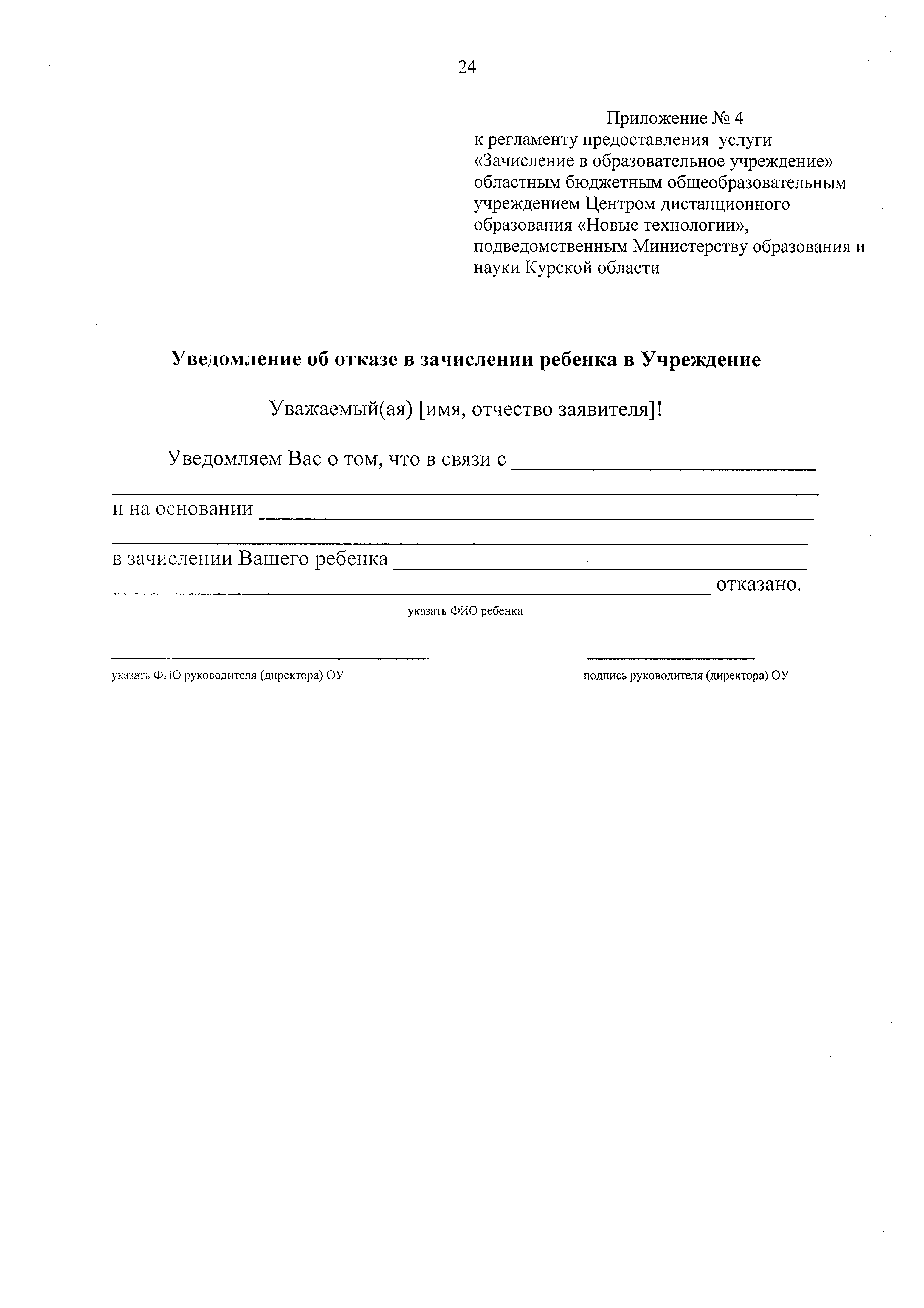 "Об утверждении регламента предоставления услуги "Зачисление в образовательное учреждение" областным бюджетным общеобразовательным учреждением Центром дистанционного образования "Новые технологии", подведомственным Министерству образования и науки Курской области"