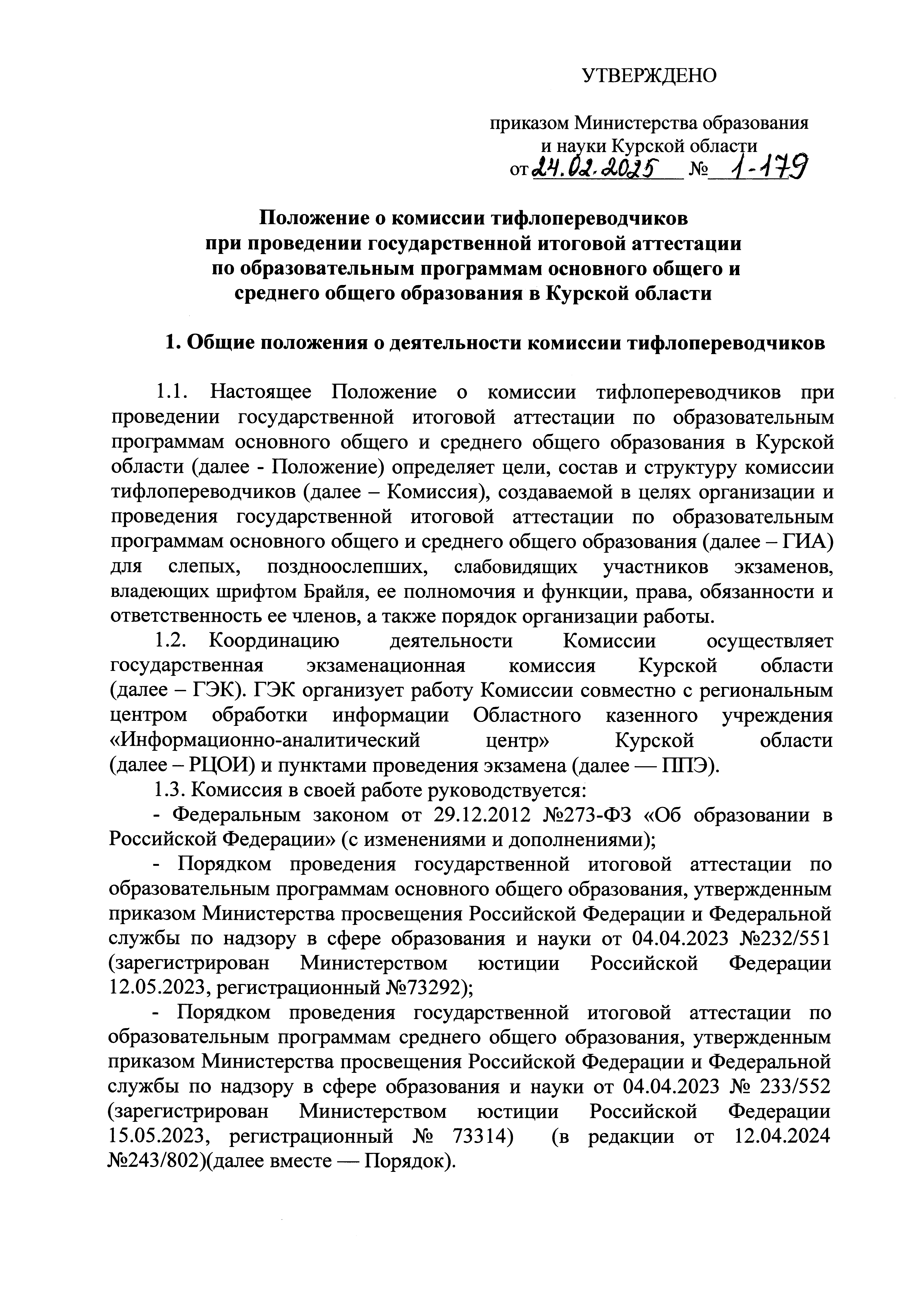 Приказ Министерства образования и науки Курской области от 24.02.2025 № 1-179