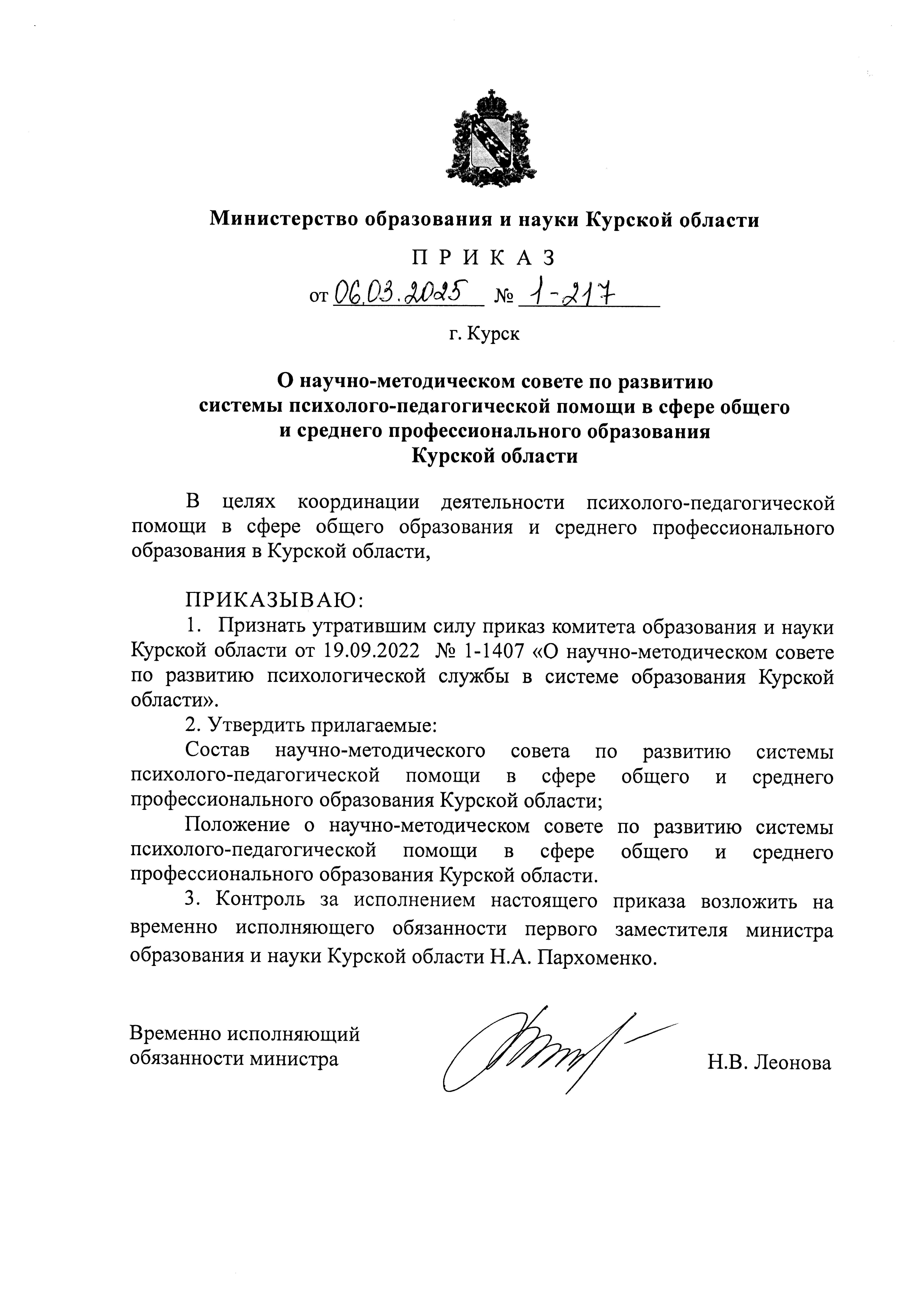 Приказ Министерства образования и науки Курской области от 06.03.2025 № 1-217