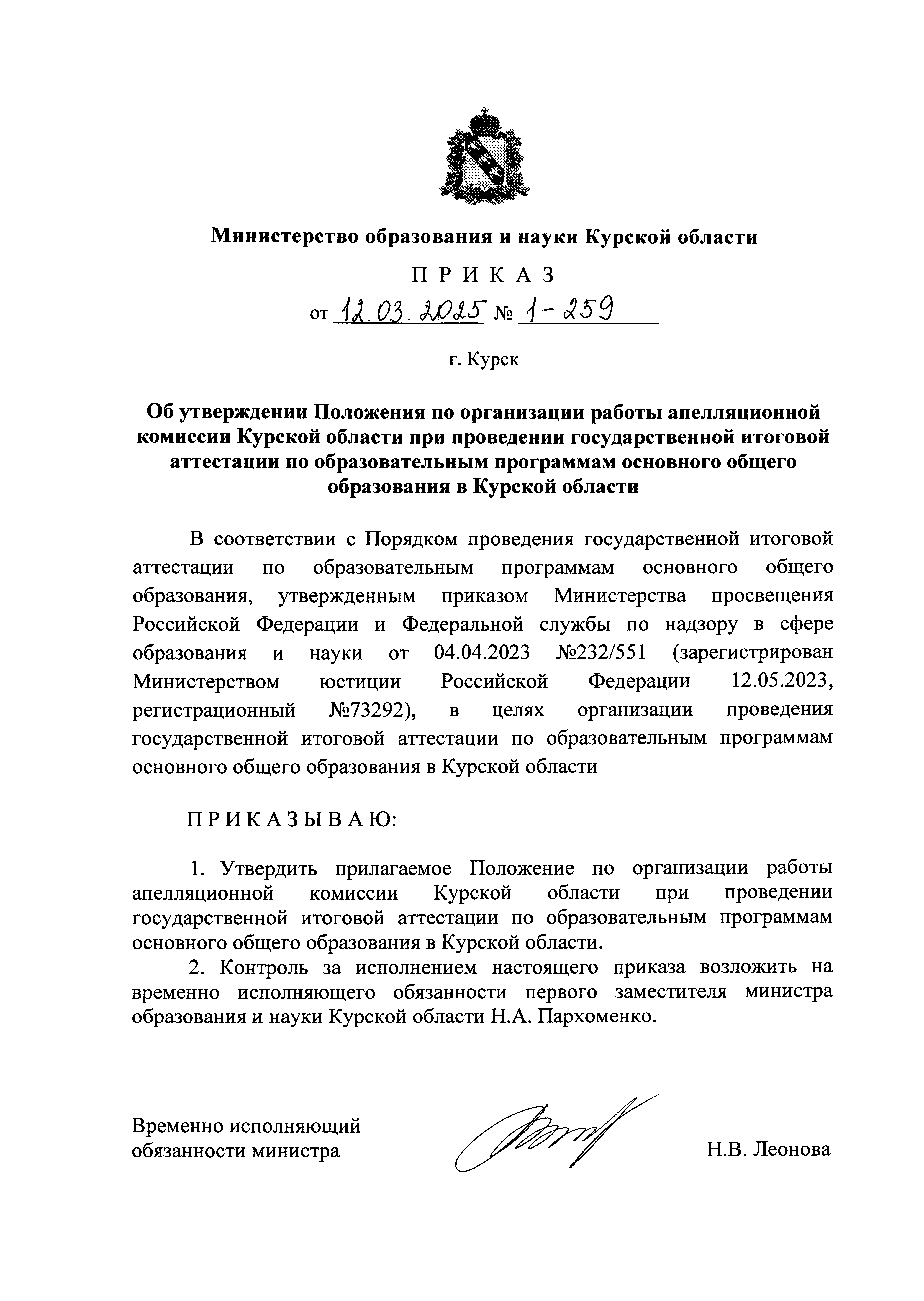 Приказ Министерства образования и науки Курской области от 12.03.2025 № 1-259