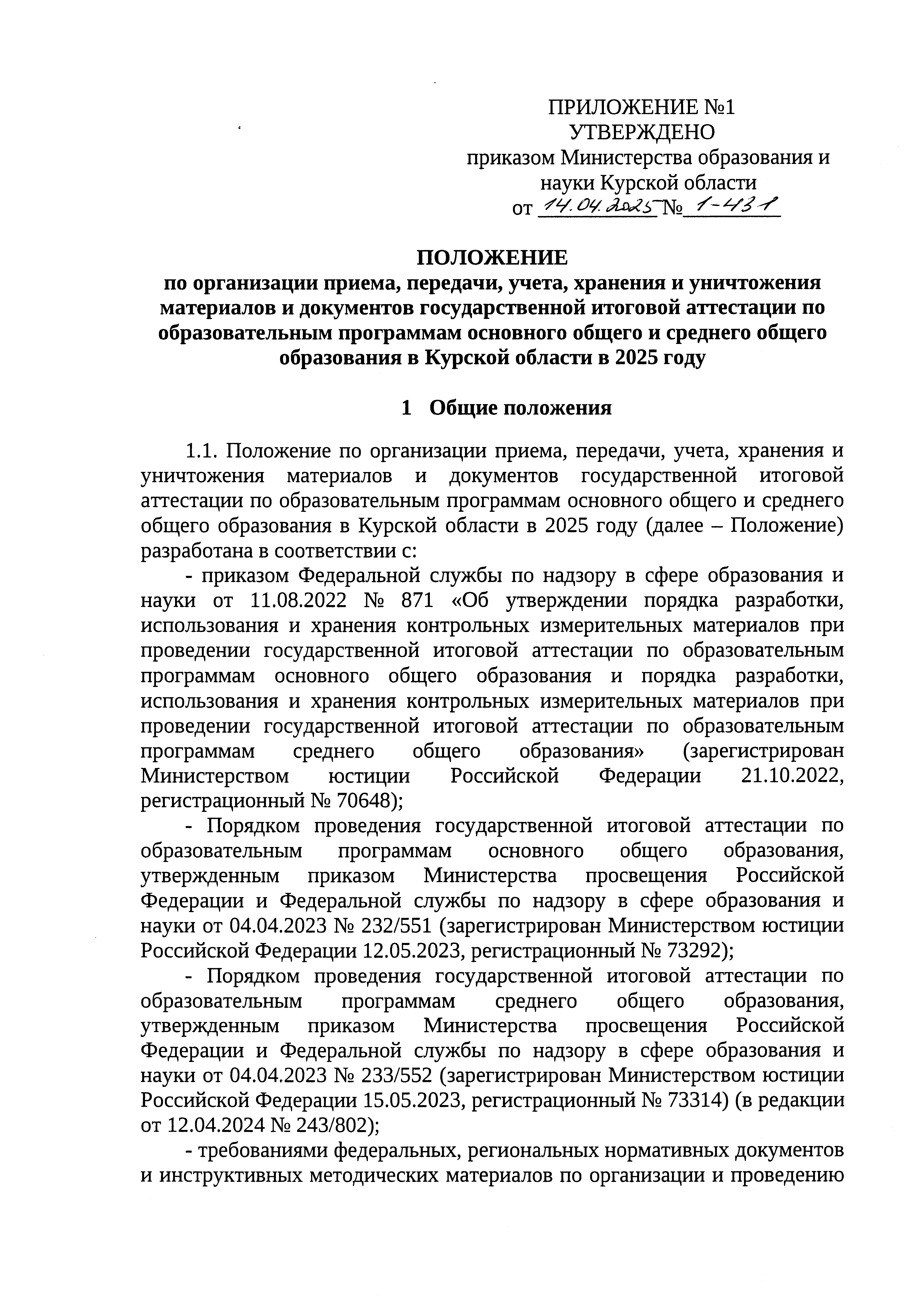 Приказ Министерства образования и науки Курской области от 14.04.2025 № 1-431