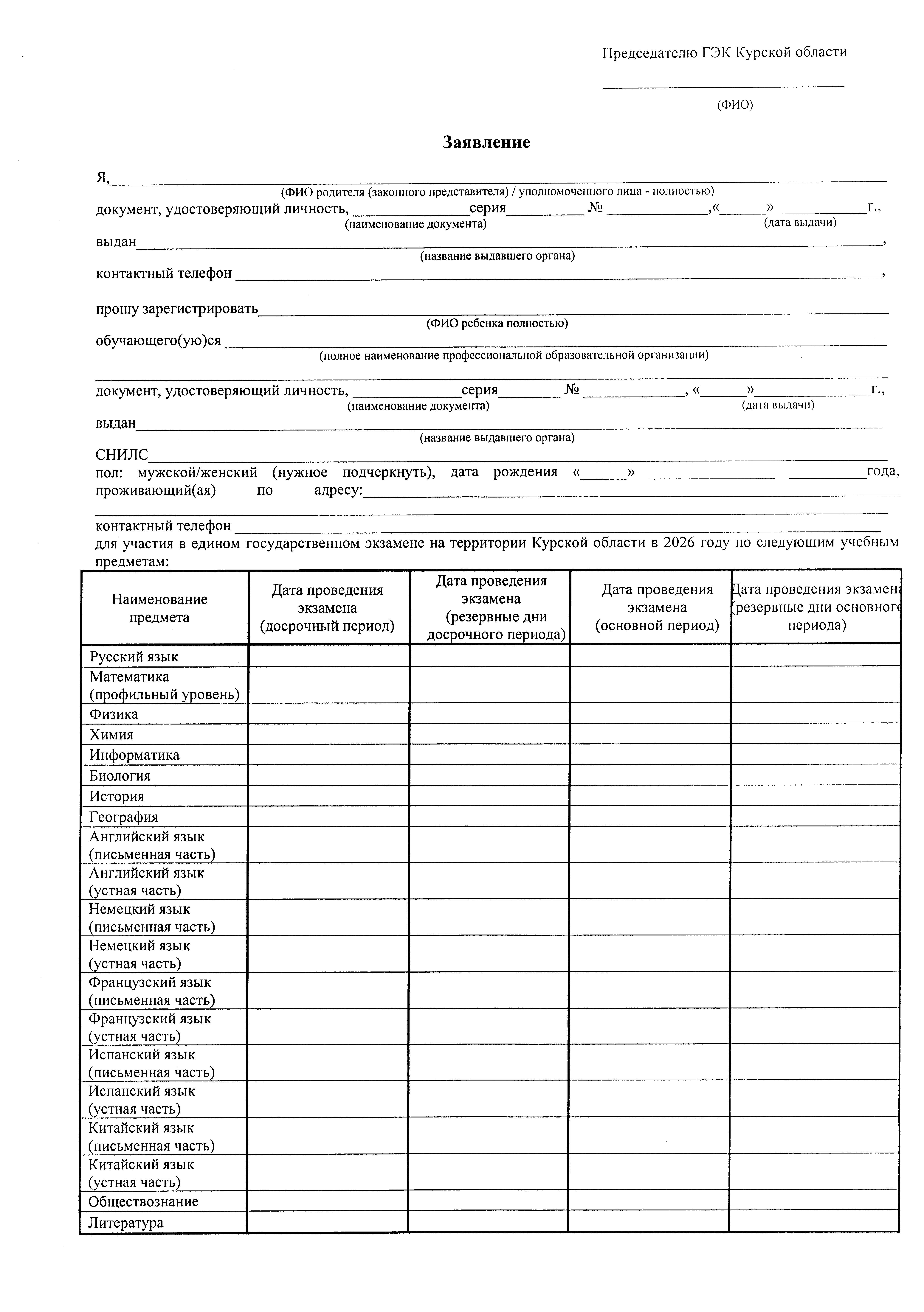 "Об утверждении форм заявлений об участии в государственной итоговой аттестации по образовательным программам среднего общего образования в Курской области в 2026 году"
