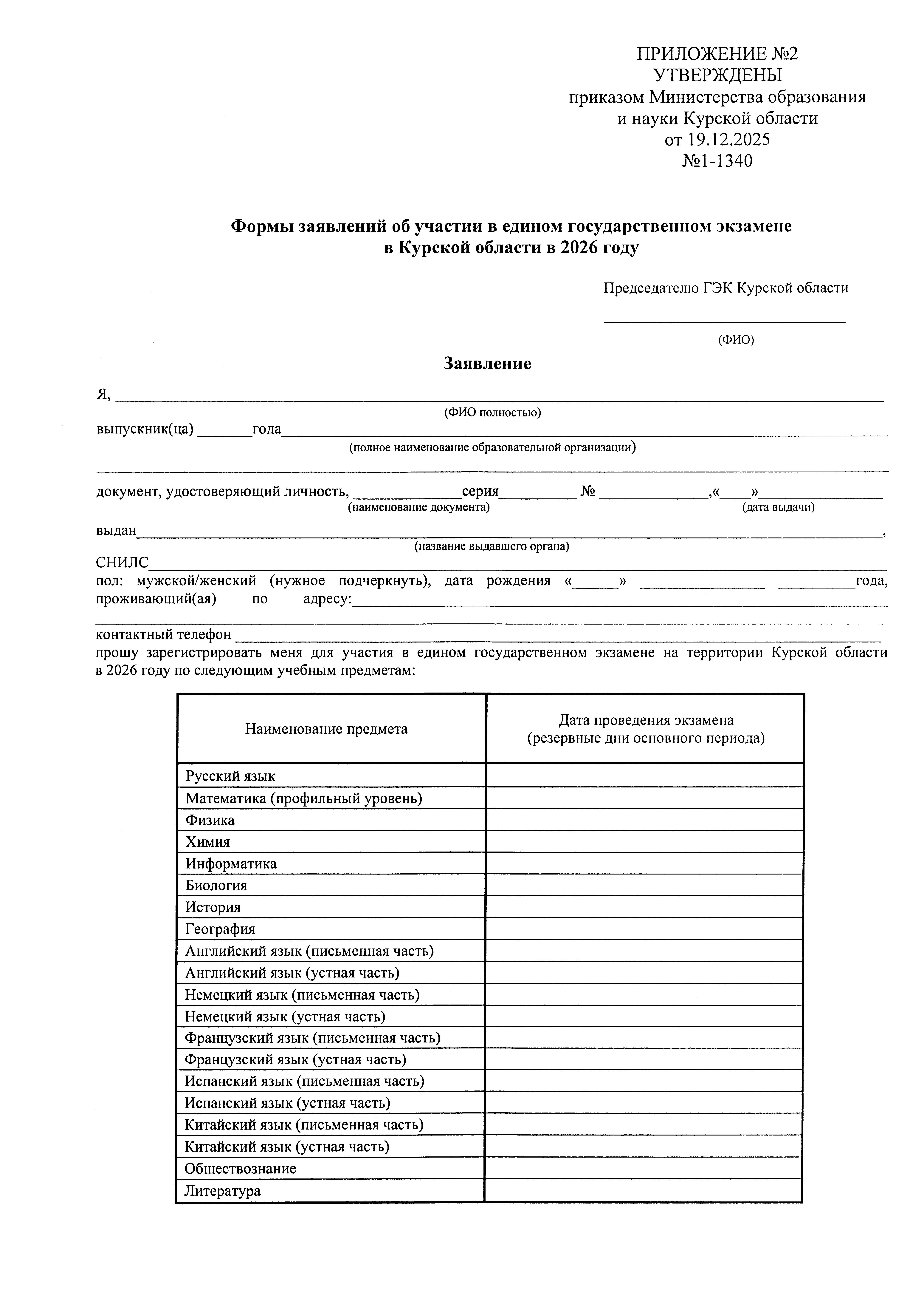 "Об утверждении форм заявлений об участии в государственной итоговой аттестации по образовательным программам среднего общего образования в Курской области в 2026 году"