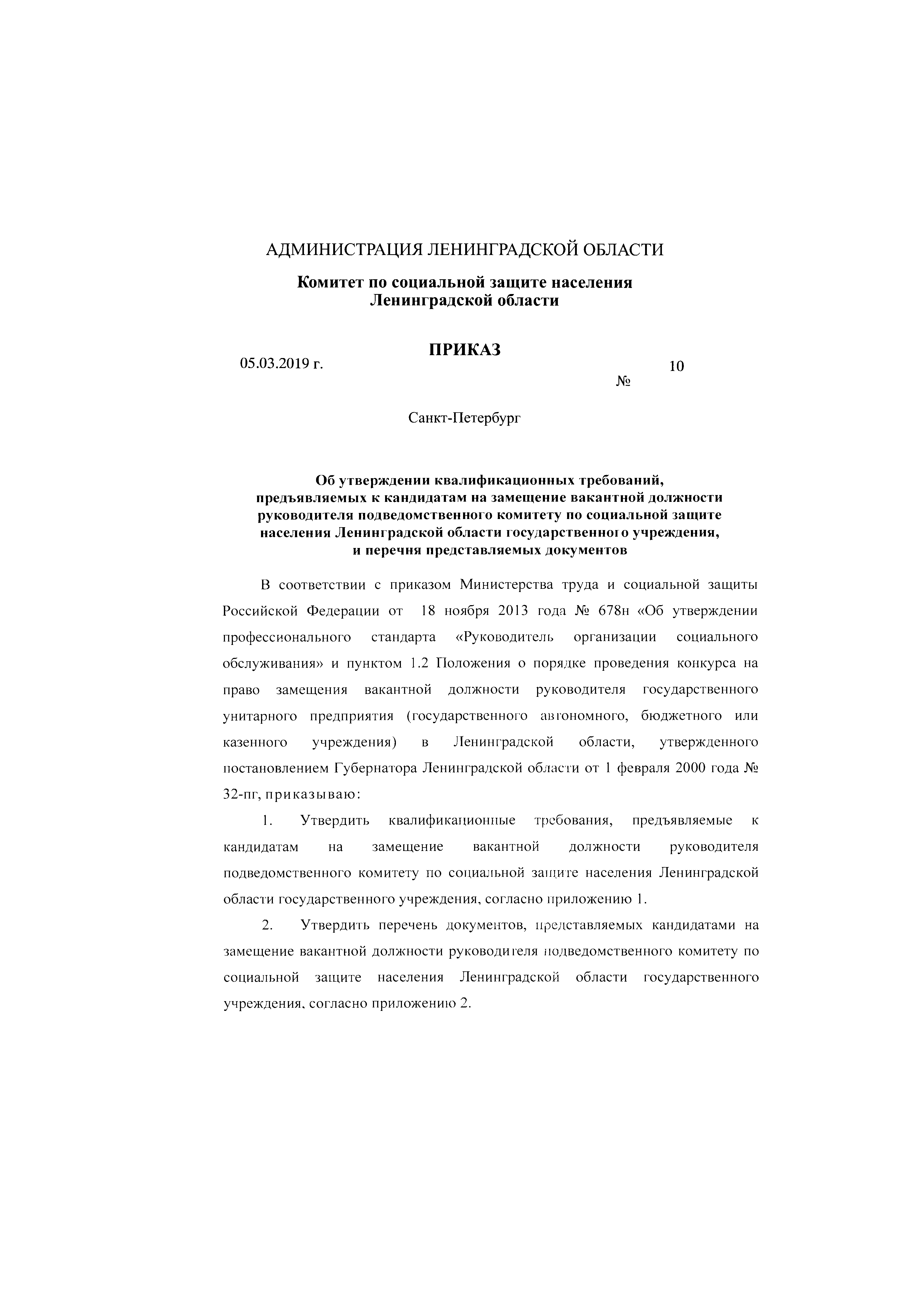 Приказ Комитета по социальной защите населения Ленинградской области от 05.03.2019 № 10