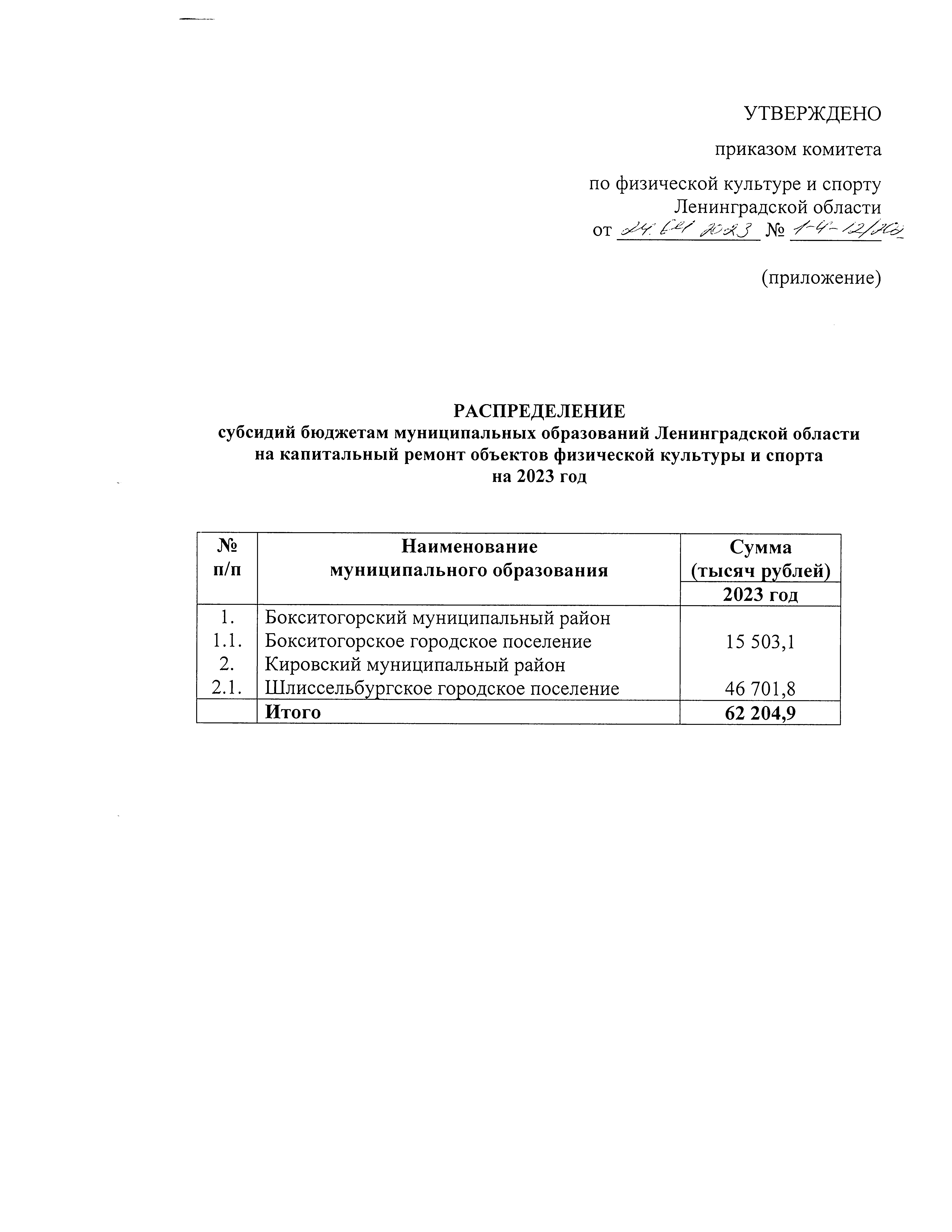 Приказ Комитета по физической культуре и спорту Ленинградской области от 24.04.2023 № 1-4-12/2023