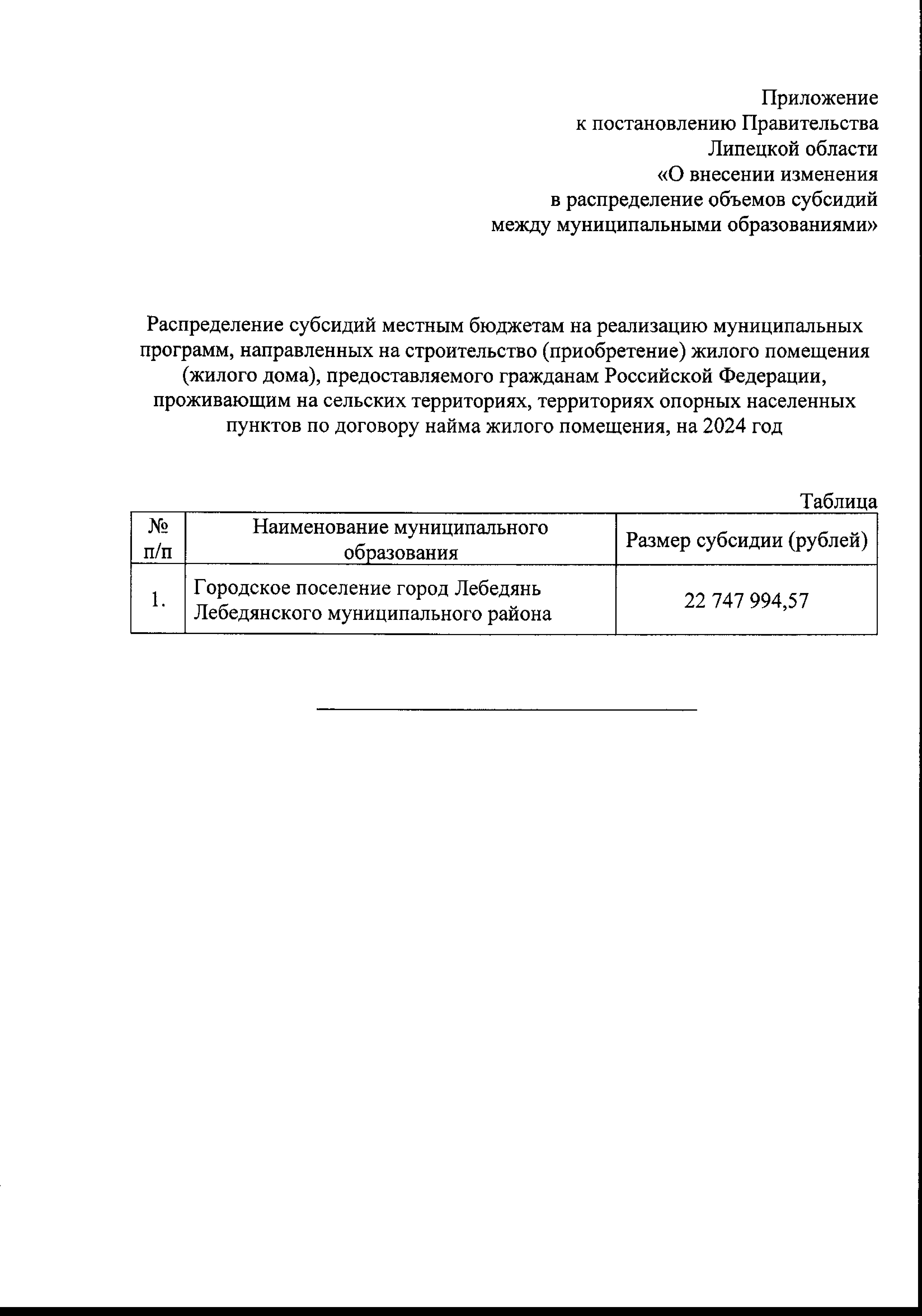 "О внесении изменения в распределение объемов субсидий между муниципальными образованиями"