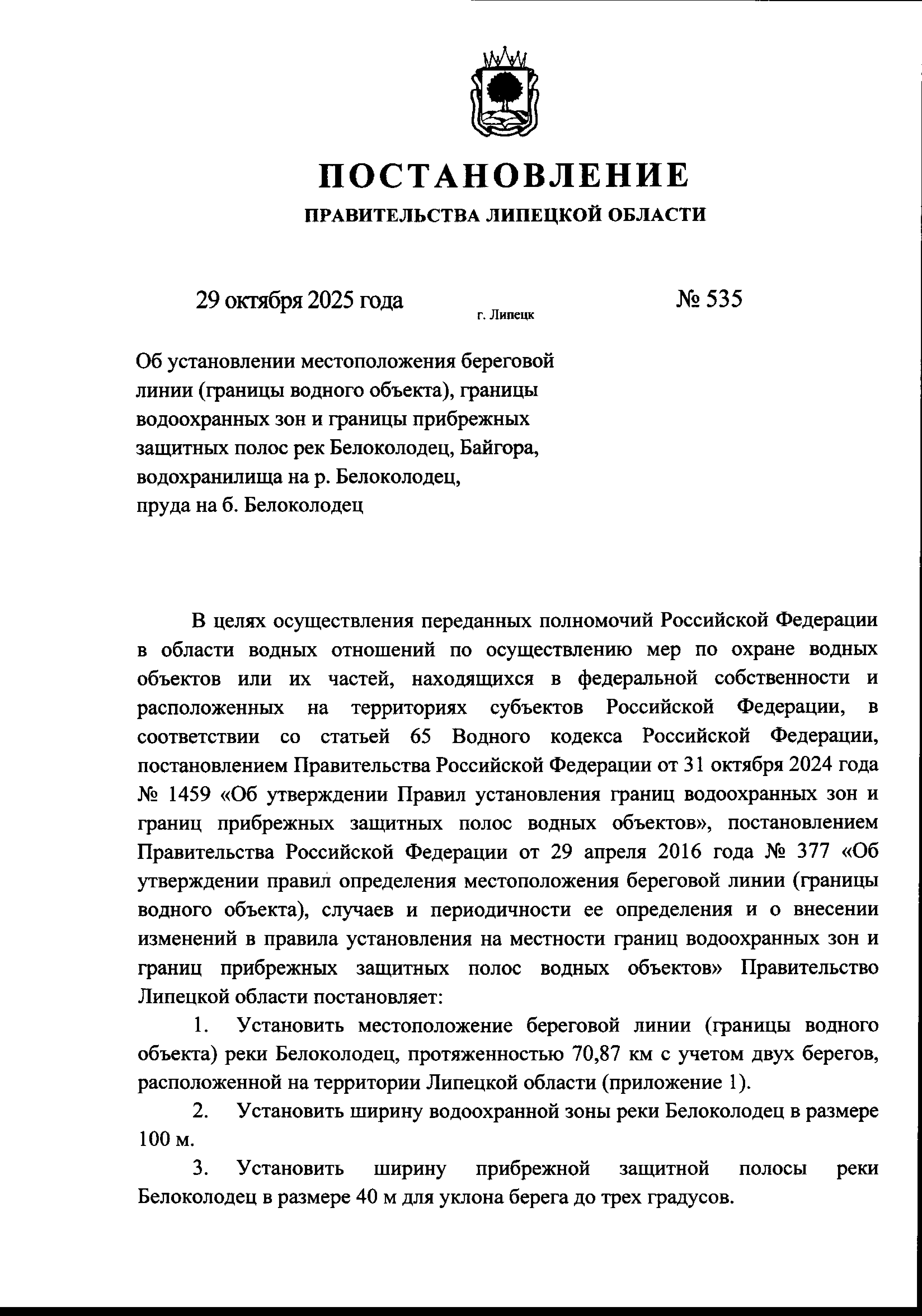 "Об установлении местоположения береговой линии (границы водного объекта), границы водоохранных зон и границы прибрежных защитных полос рек Белоколодец, Байгора, водохранилища на р. Белоколодец, пруда на б. Белоколодец"