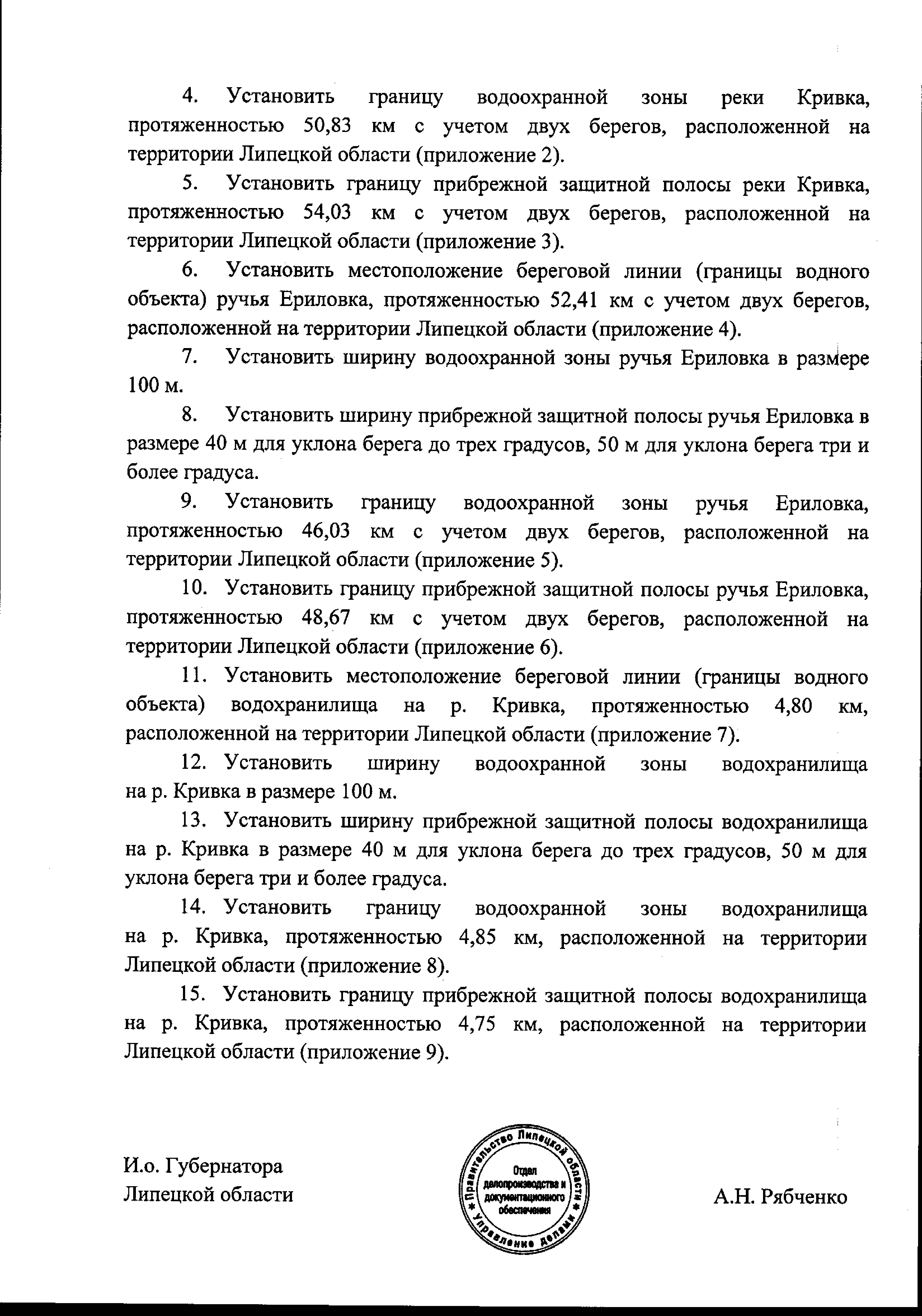 "Об установлении местоположения береговой линии (границы водного объекта), границы водоохранных зон и границы прибрежных защитных полос реки Кривка, ручья Ериловка, водохранилища на р. Кривка"