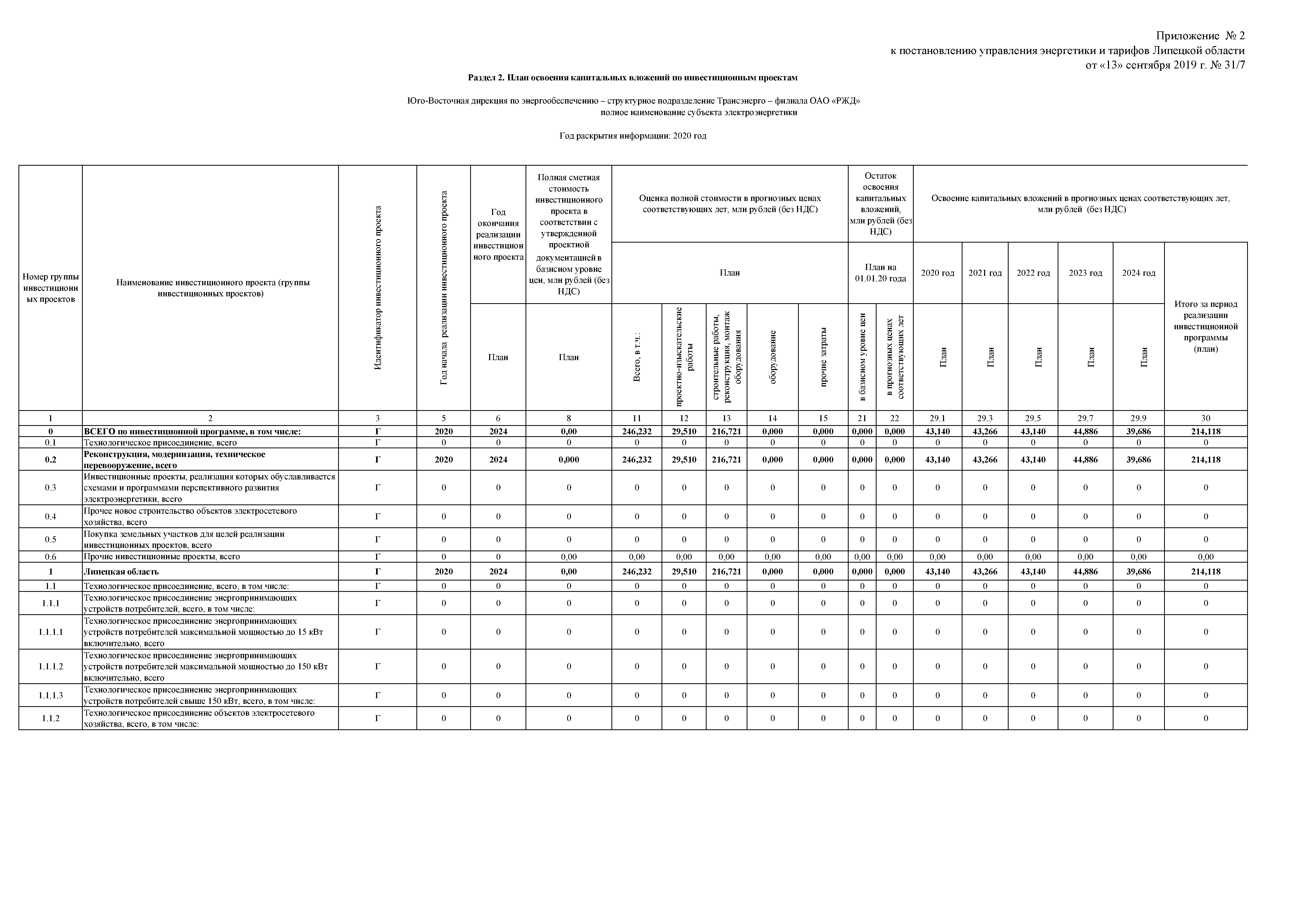 "Об утверждении инвестиционной программы ОАО "Российские железные дороги" (Юго-Восточная дирекция по энергообеспечению - структурное подразделение "Трансэнерго" - филиала "Российские железные дороги" на территории Липецкой области) на 2020-2024 годы"