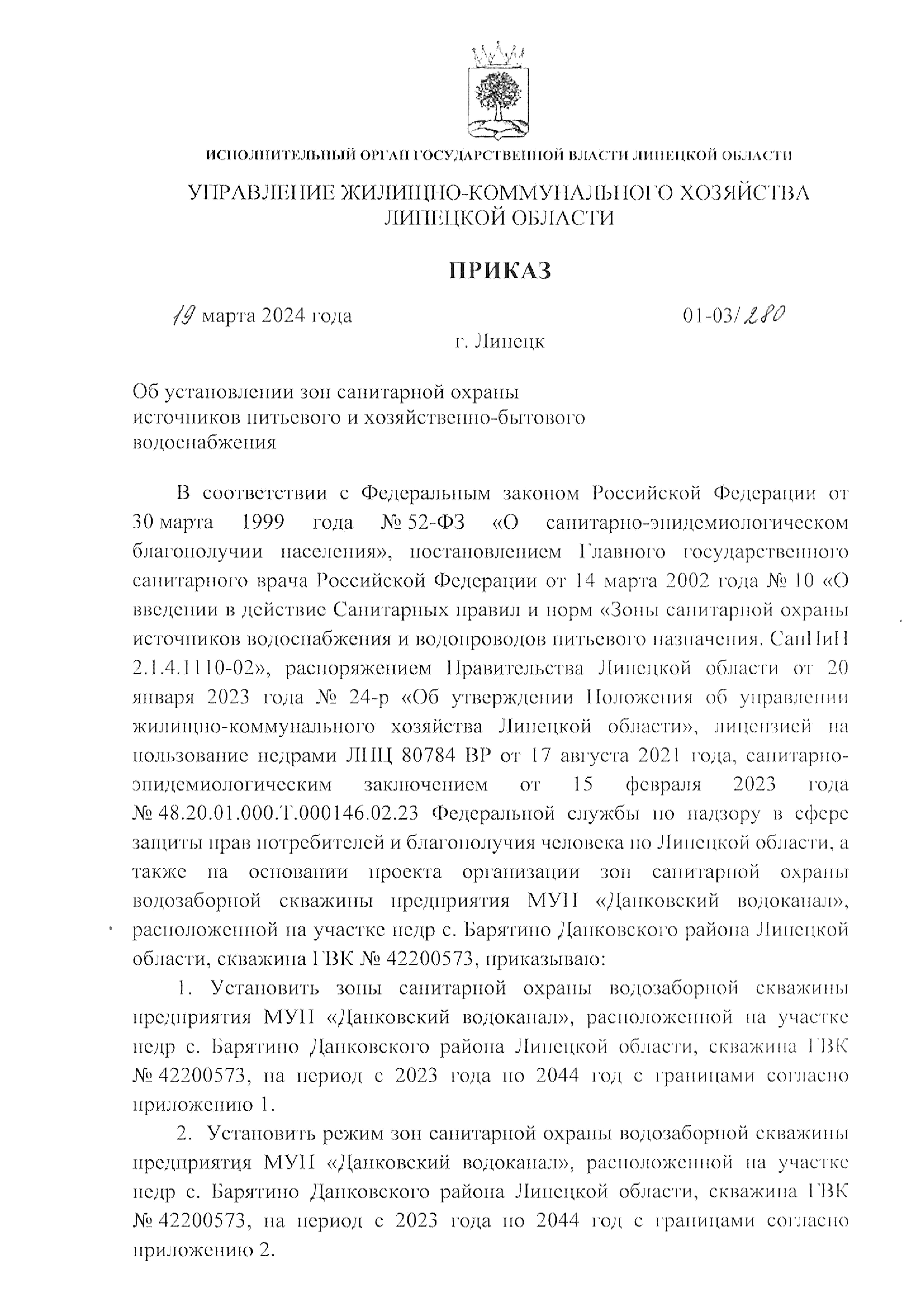 Приказ управления жилищно-коммунального хозяйства Липецкой области от 19.03.2024 № 01-03/280