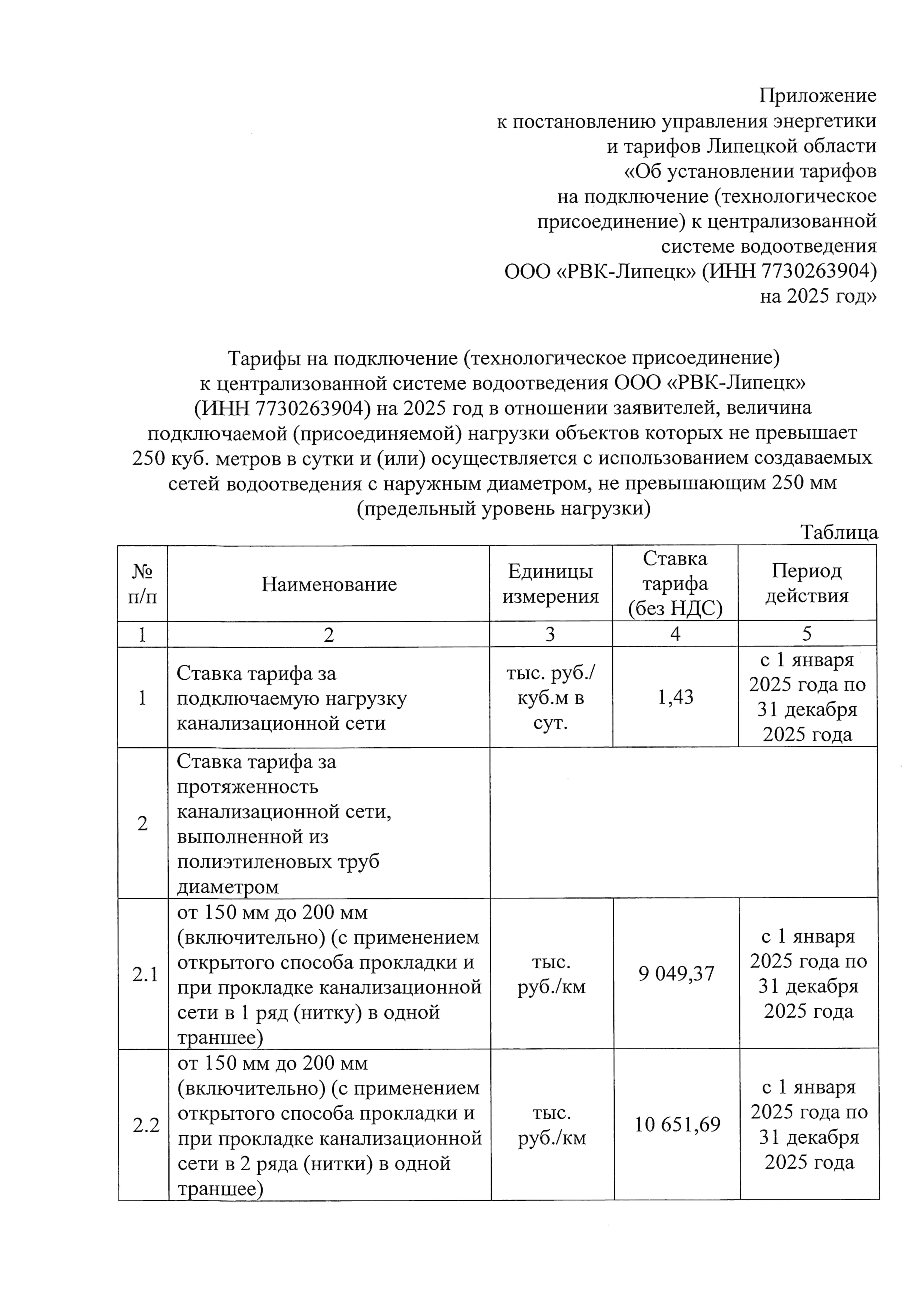 "Об установлении тарифов на подключение (технологическое присоединение) к централизованной системе водоотведения ООО "РВК-Липецк" (ИНН 7730263904) на 2025 год"
