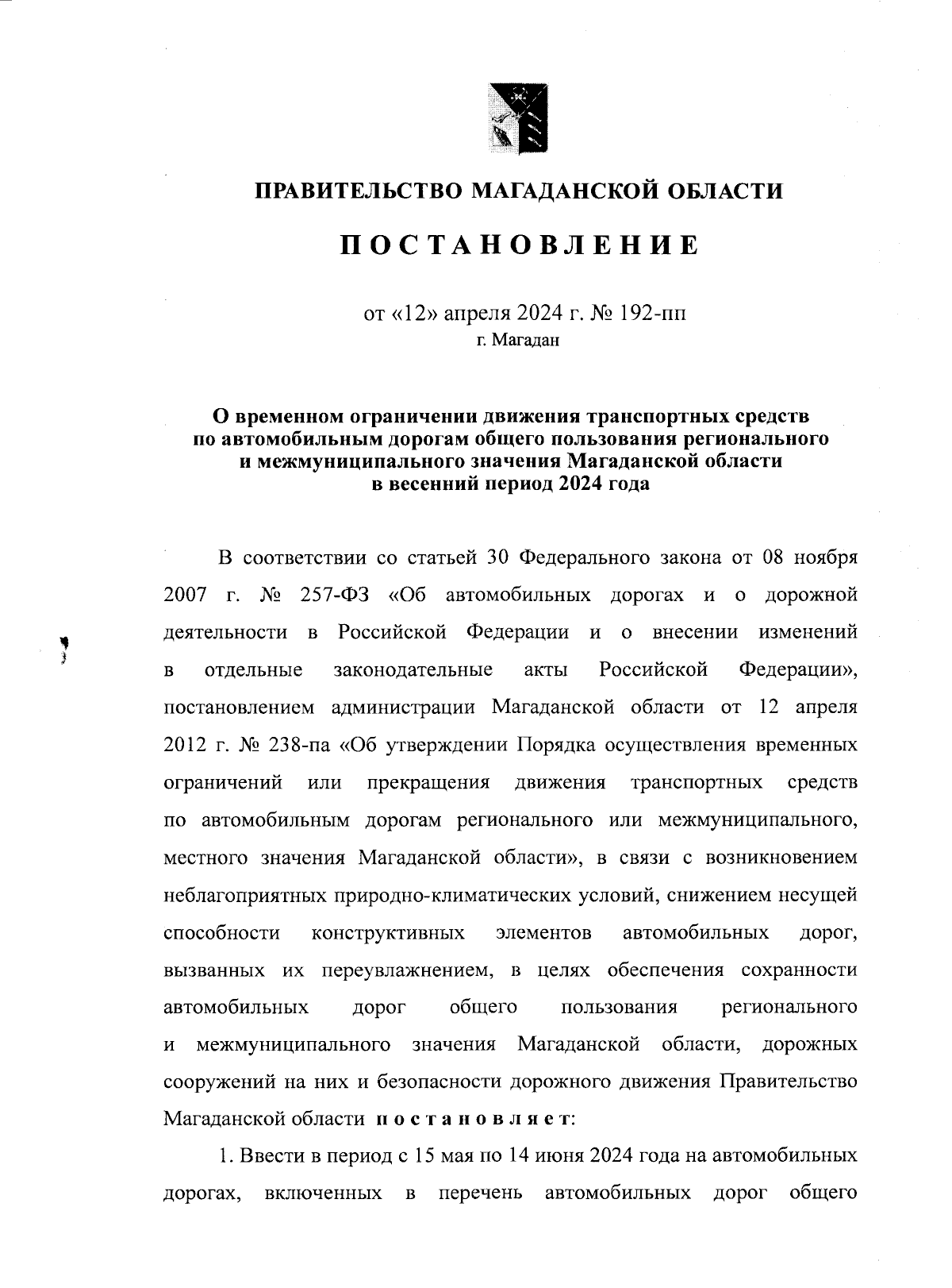 Постановление Правительства Магаданской области от 12.04.2024 № 192-пп