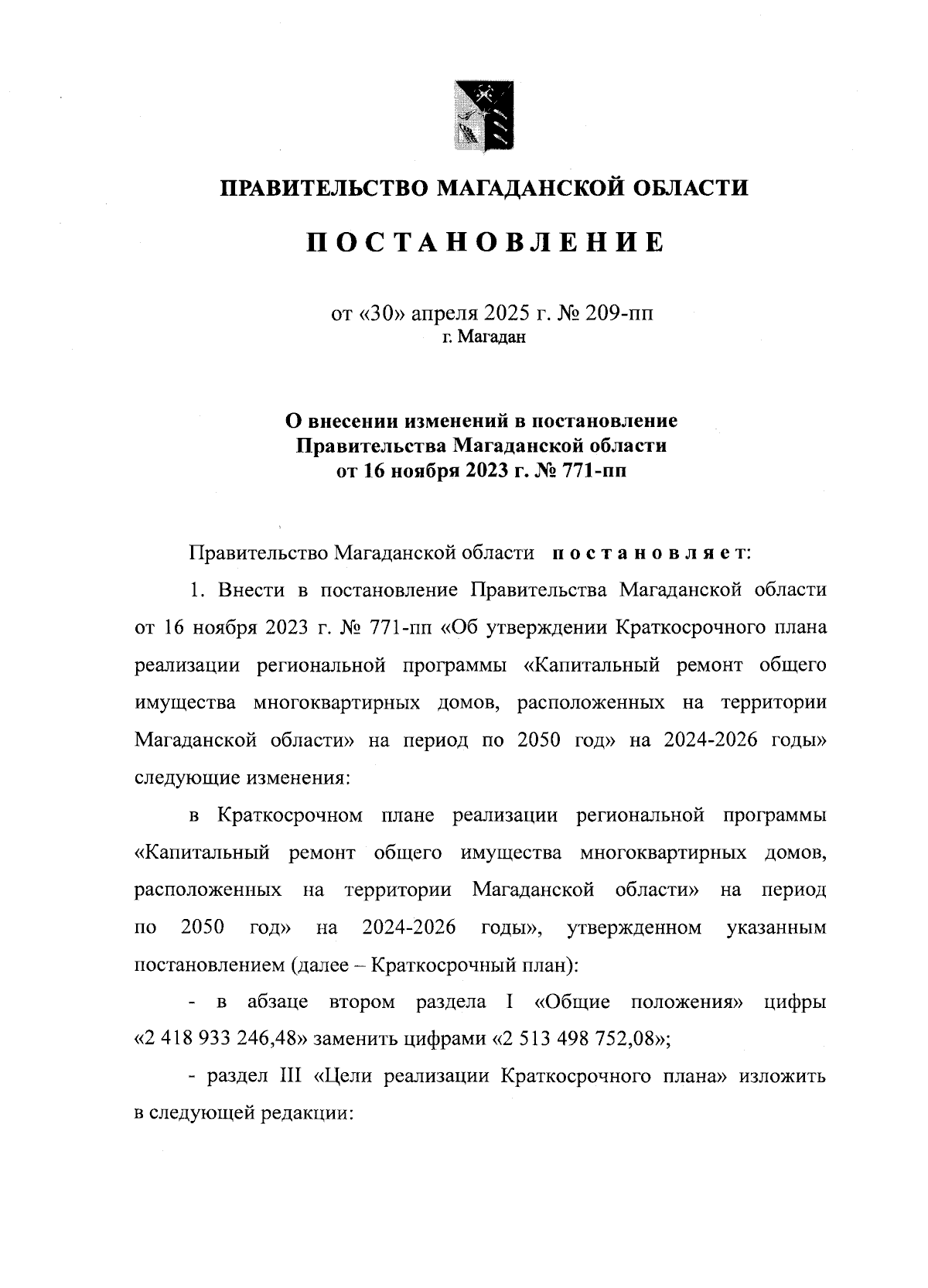 "О внесении изменений в постановление Правительства Магаданской области от 16 ноября 2023 г. № 771-пп "Об утверждении Краткосрочного плана реализации региональной программы "Капитальный ремонт общего имущества многоквартирных домов, расположенных на территории Магаданской области" на период по 2050 год" на 2024-2026 годы"