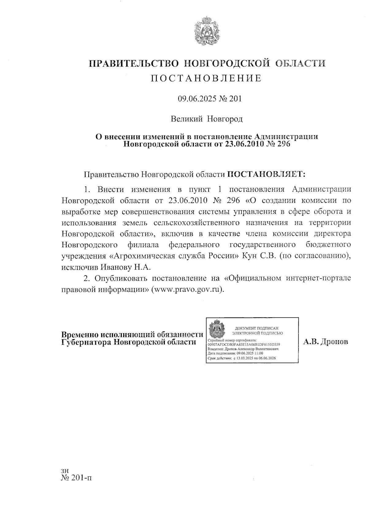 Постановление Правительства Новгородской области от 09.06.2025 № 201