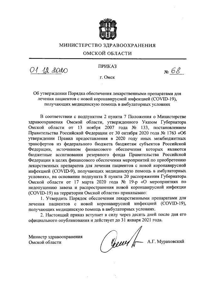 Приказ Министерства здравоохранения Омской области от 01.12.2020 № 68