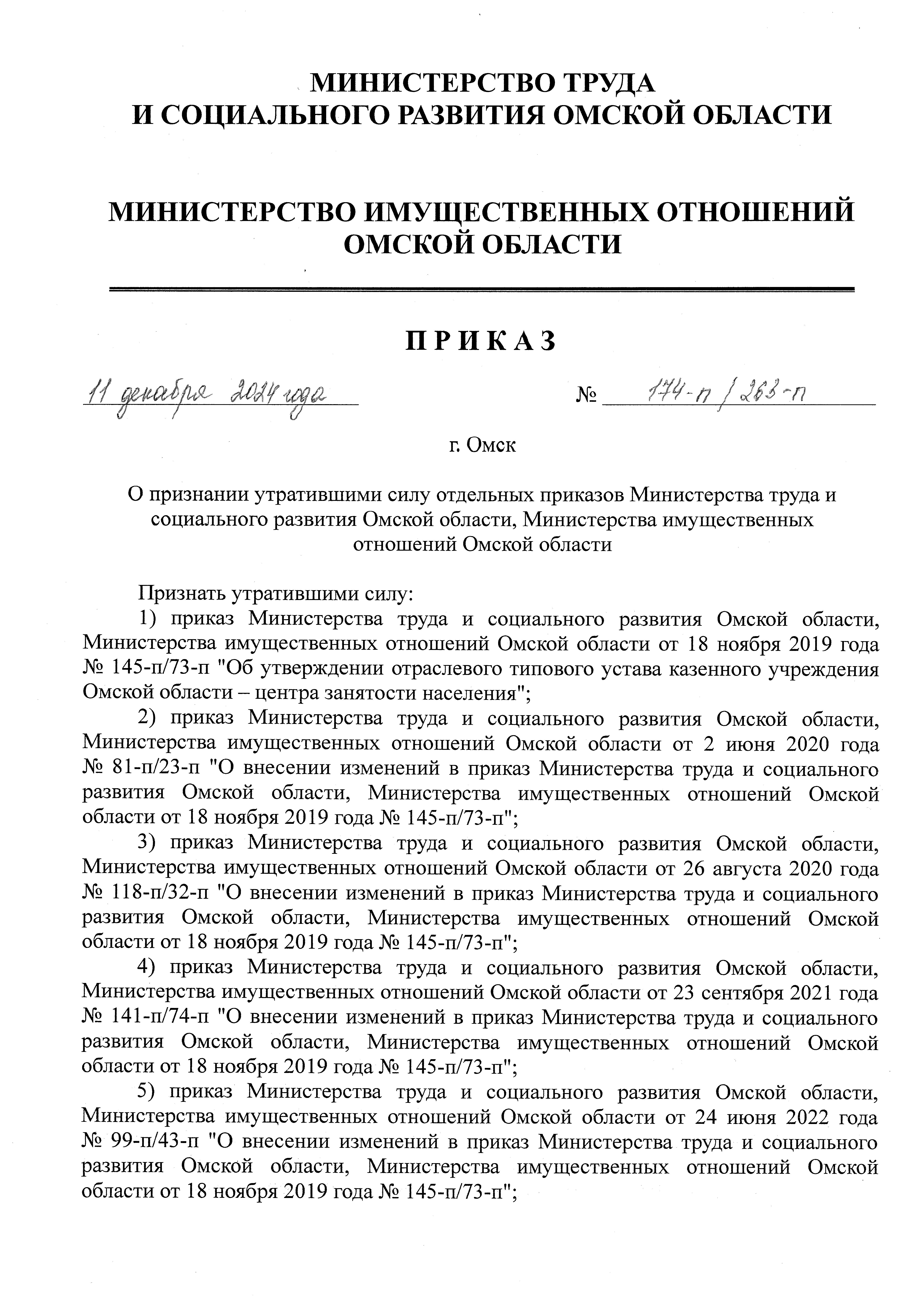 Приказ Министерства труда и социального развития Омской области, Министерства имущественных отношений Омской области от 11.12.2024 № 174-п/263-п