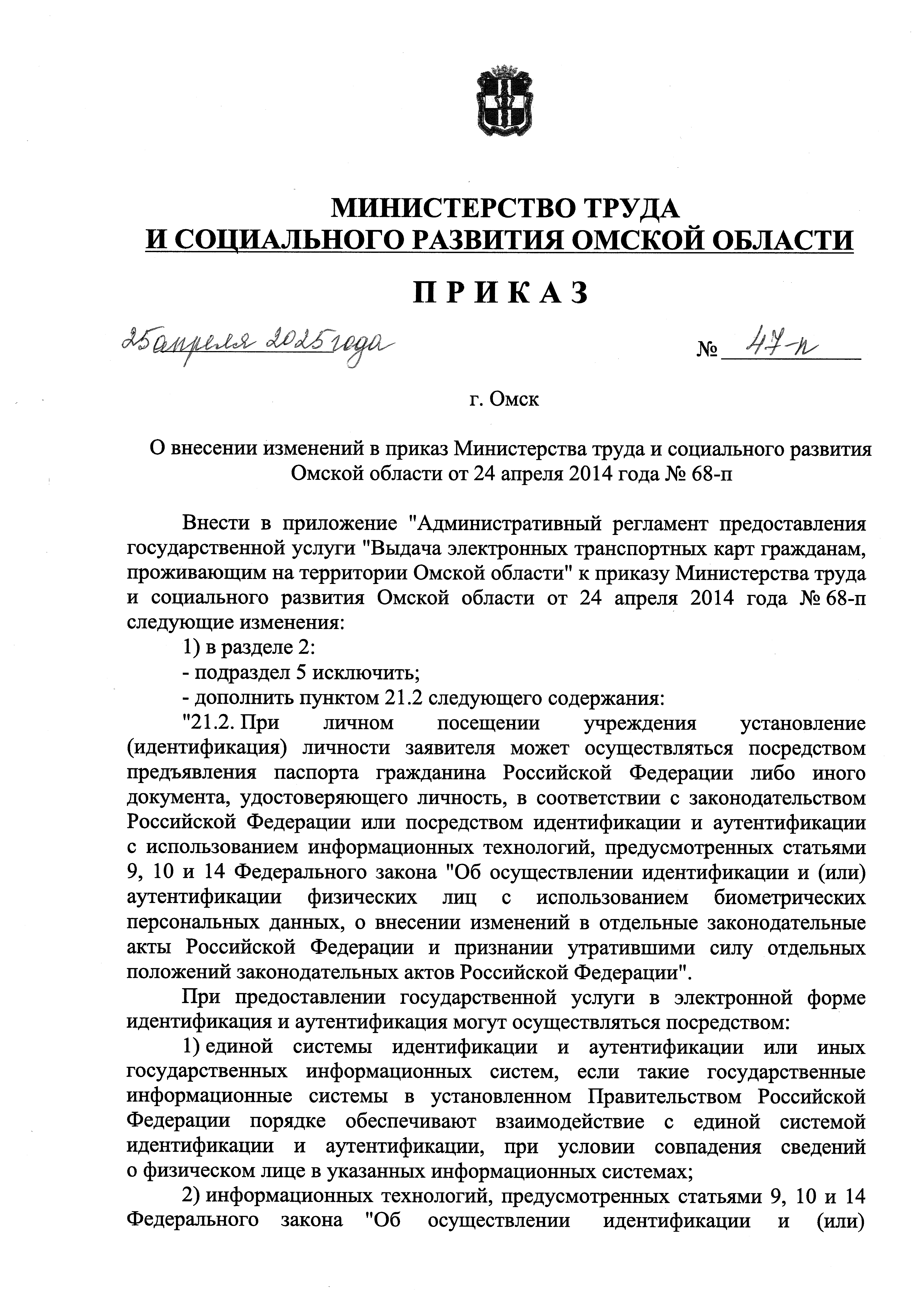 Приказ Министерства труда и социального развития Омской области от 25.04.2025 № 47-п