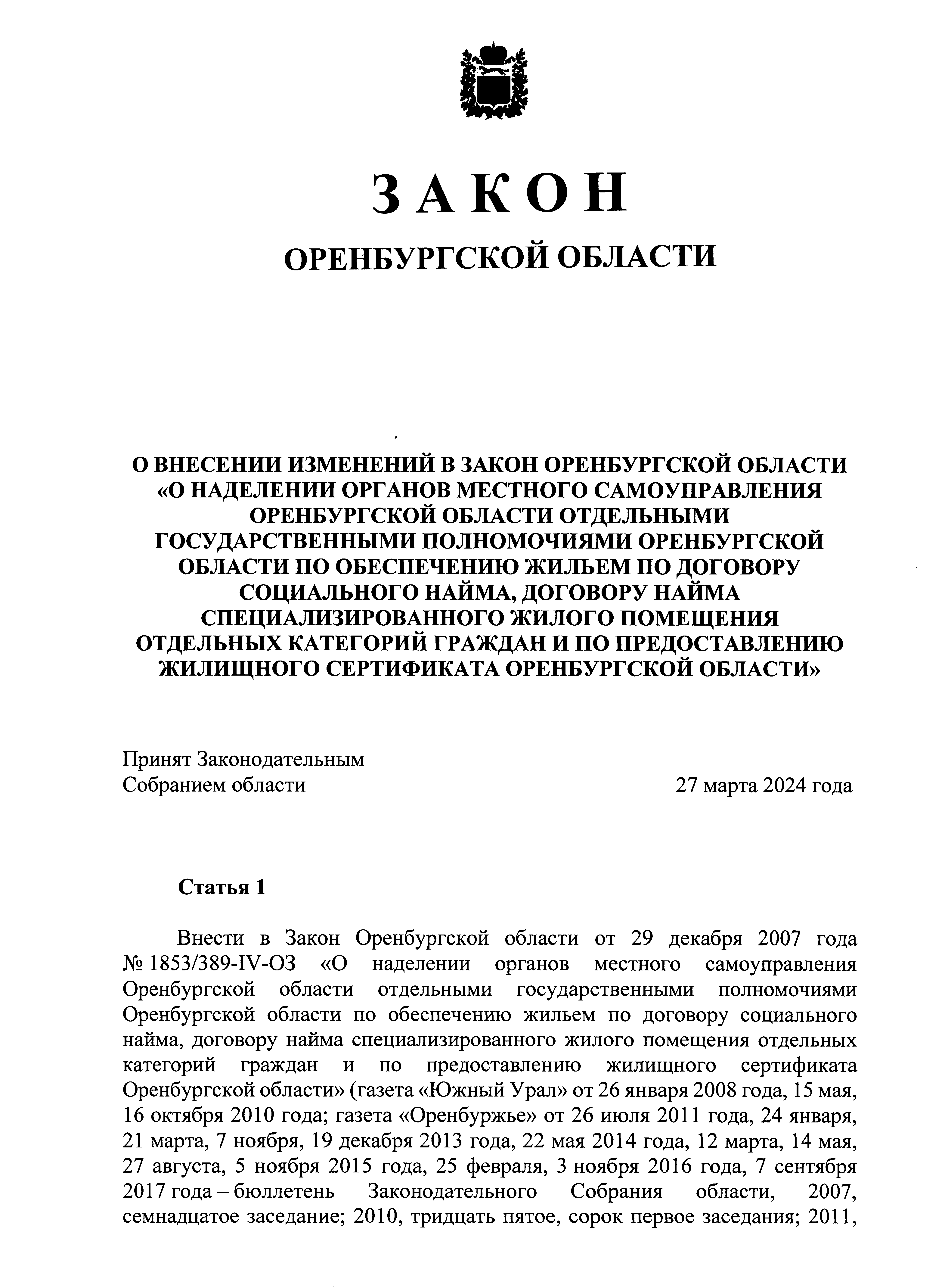 "О внесении изменений в Закон Оренбургской области "О наделении органов местного самоуправления Оренбургской области отдельными государственными полномочиями Оренбургской области по обеспечению жильем по договору социального найма, договору найма специализированного жилого помещения отдельных категорий граждан и по предоставлению жилищного сертификата Оренбургской области"